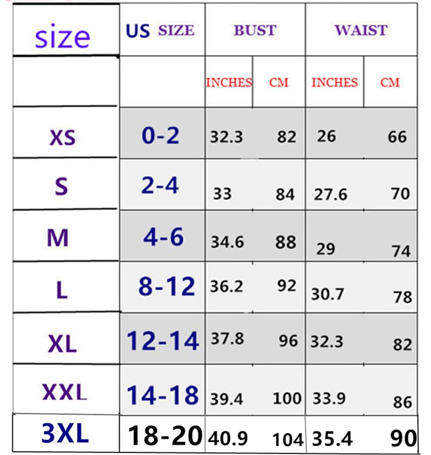 Description you can choose the size refrence from following size measurements: XS size for US 0-2 waist:26"/66cm", Bust:32.3"/82cm, S size for US 2-4 waist:27.6"/70cm, Bust: 33"/84cm, M size for US 4-6 waist:29"/74cm, Bust: 34.6"/88cm, L size for US 8-10 waist:30.7"/78cm, Bust: 36.2"/92cm, XL size for US 12-14 waist:32.3"/82cm, Bust:37.8"/96cm, XXL size for US 14-18 waist:33.9"/86cm, Bust:39.4"/100cm, 3XL size for US 18-20 waist:35,4"/90cm, Bust:40.9"/104cm.