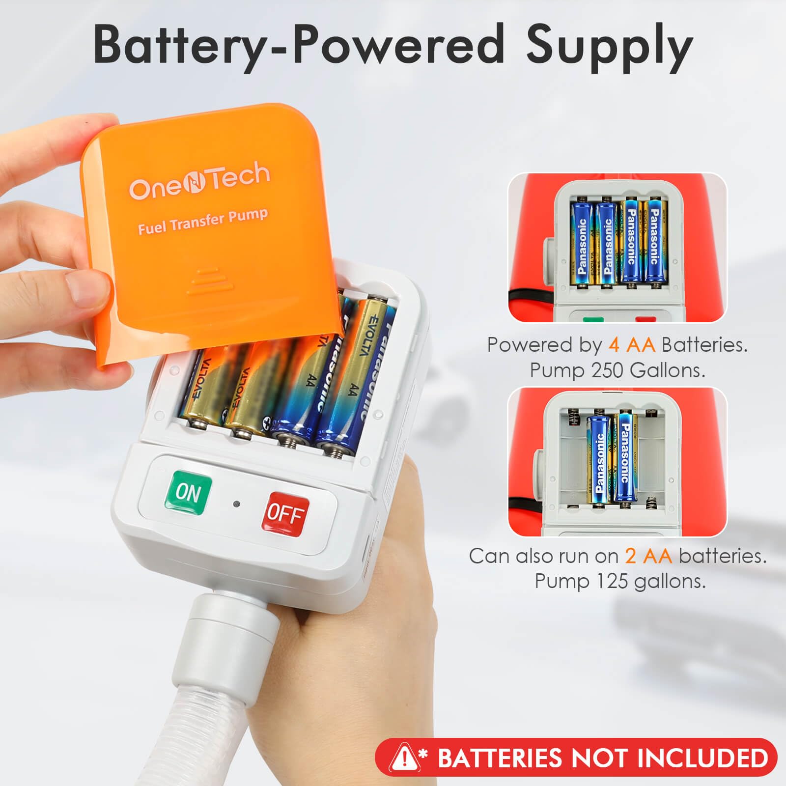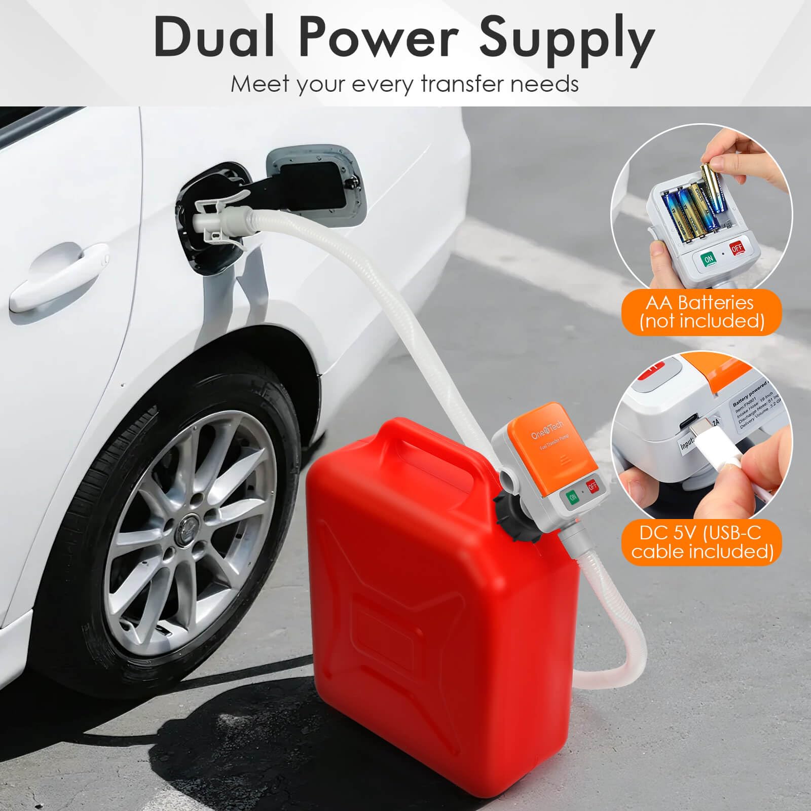 DUAL POWER OPTIONS: The fluid transfer pump operates with 4xAA batteries or convenient low-power DC 5V via the included USB-C cable. (Batteries and Gas Can Not Included)