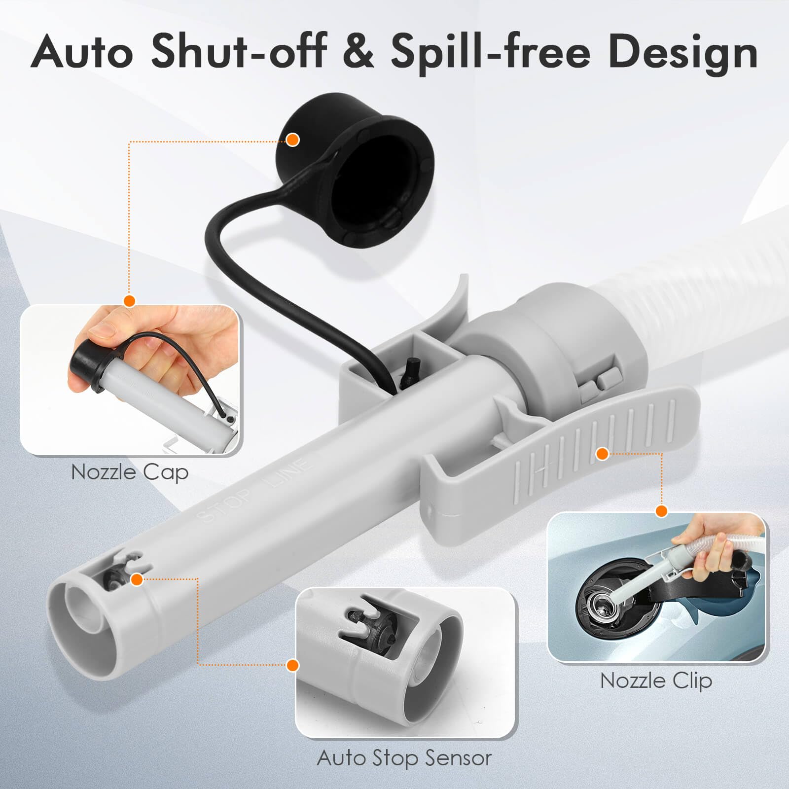 AUTO-STOP & SPILL-FREE DESIGN: The portable fuel pump features an automatic shut-off sensor that stops the flow when full. A built-in nozzle clip secures it to your vehicle, while the integrated nozzle cap and nozzle holder prevent drips and leaks.