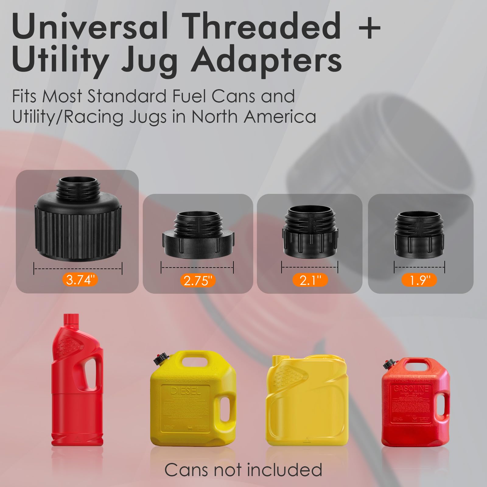 FITS MOST STANDARD CANS: This versatile gas transfer pump comes with 4 can adapters, fitting securely on most standard fuel cans and utility jugs commonly used throughout North America.