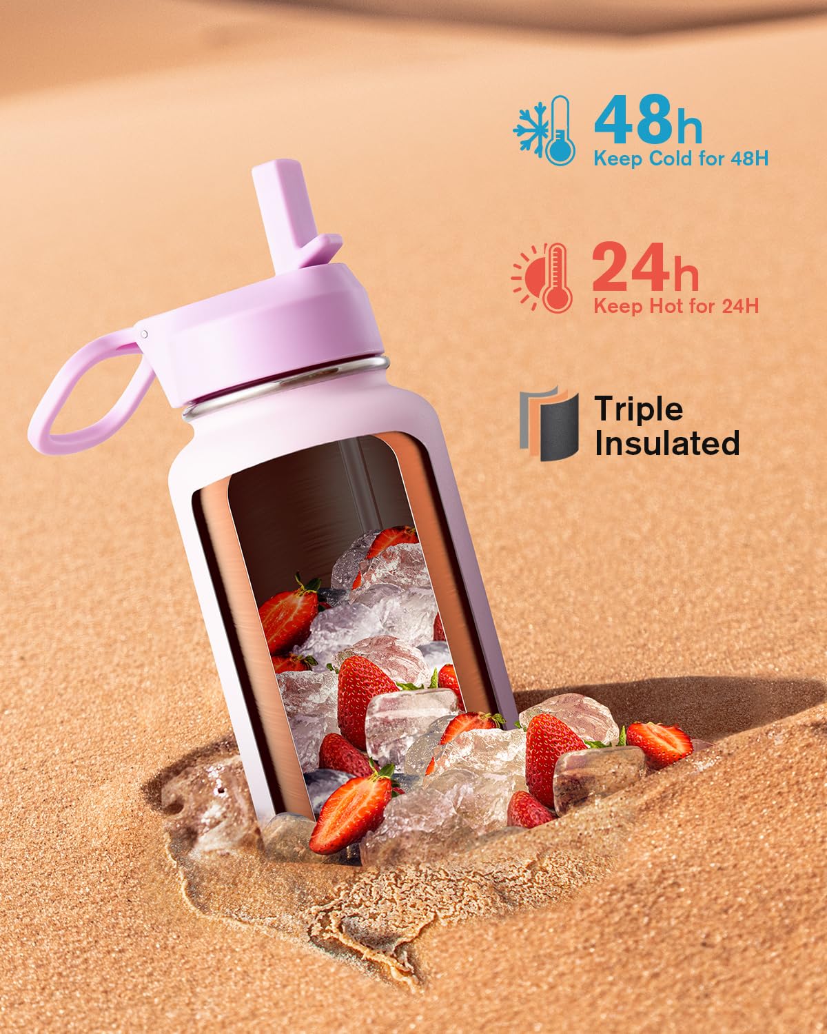 48H Cold & 24H Hot: Triple Insulation Technology adopts double wall and vacuum seal, keeps beverages cold for up to 48 hours and hot 24 hours. Anti-sweat coating can keep the surface dry and clean, making it easy to grip