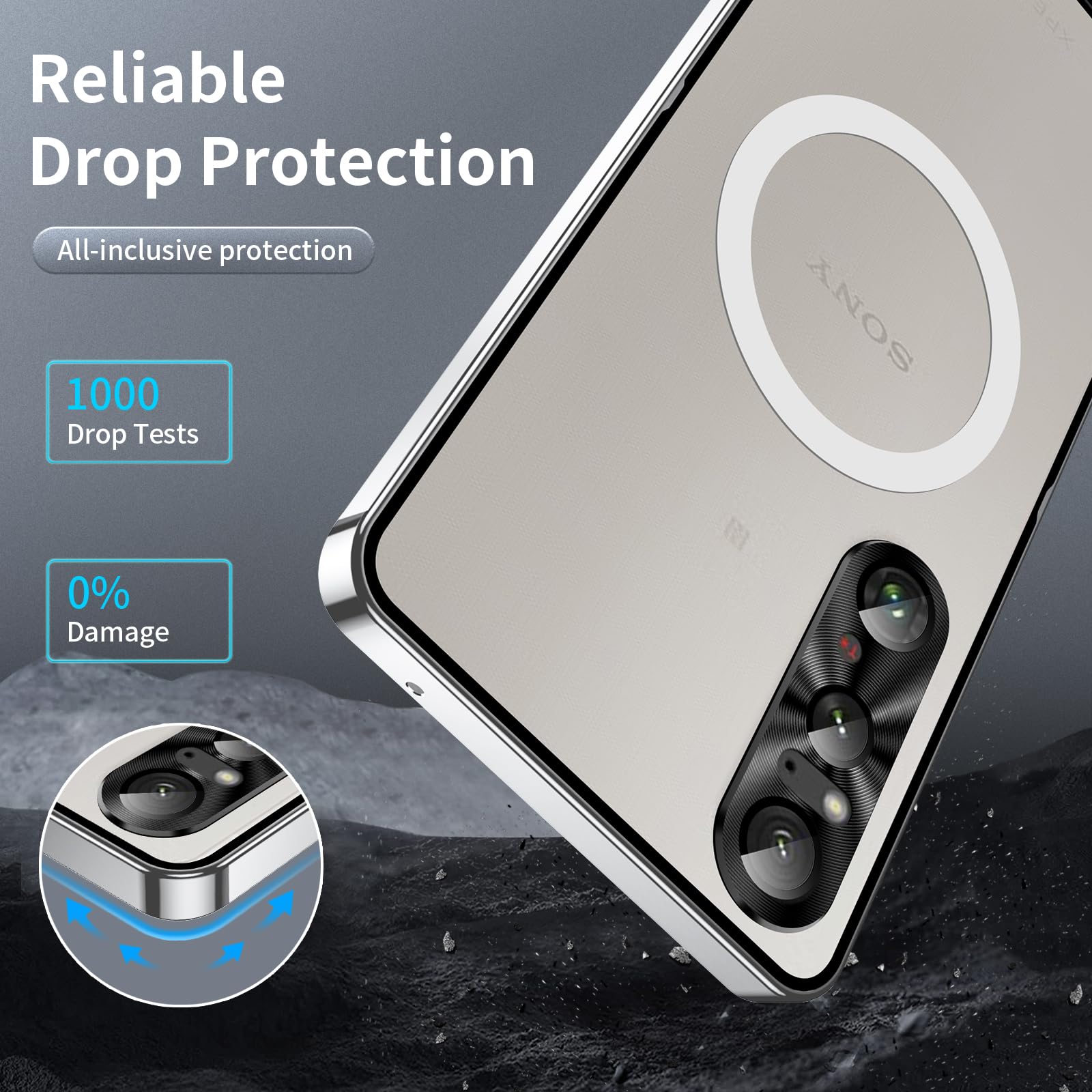 Compatible Model: for Sony Xperia 1 VI 2024[Note: This case does Not come with screen protector] Materials: Stainless Steel + TPU + Composite Material Unique Design This cell phone case is made of high-quality aluminum alloy frame with a transparent matte non-slip design on the back. Built-in lock, embedded in the body, easy to use, not easy to fall off. Anti-fingerprint Matte PC material feels good in hand, does not leave fingerprints and grease. Perfectly Fit This case features precise cutouts ensure easy access to all buttons and ports with nice tactility.