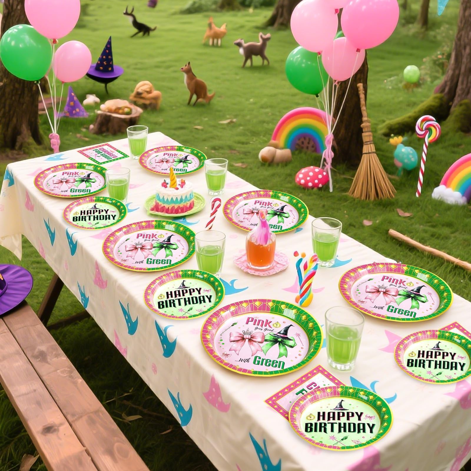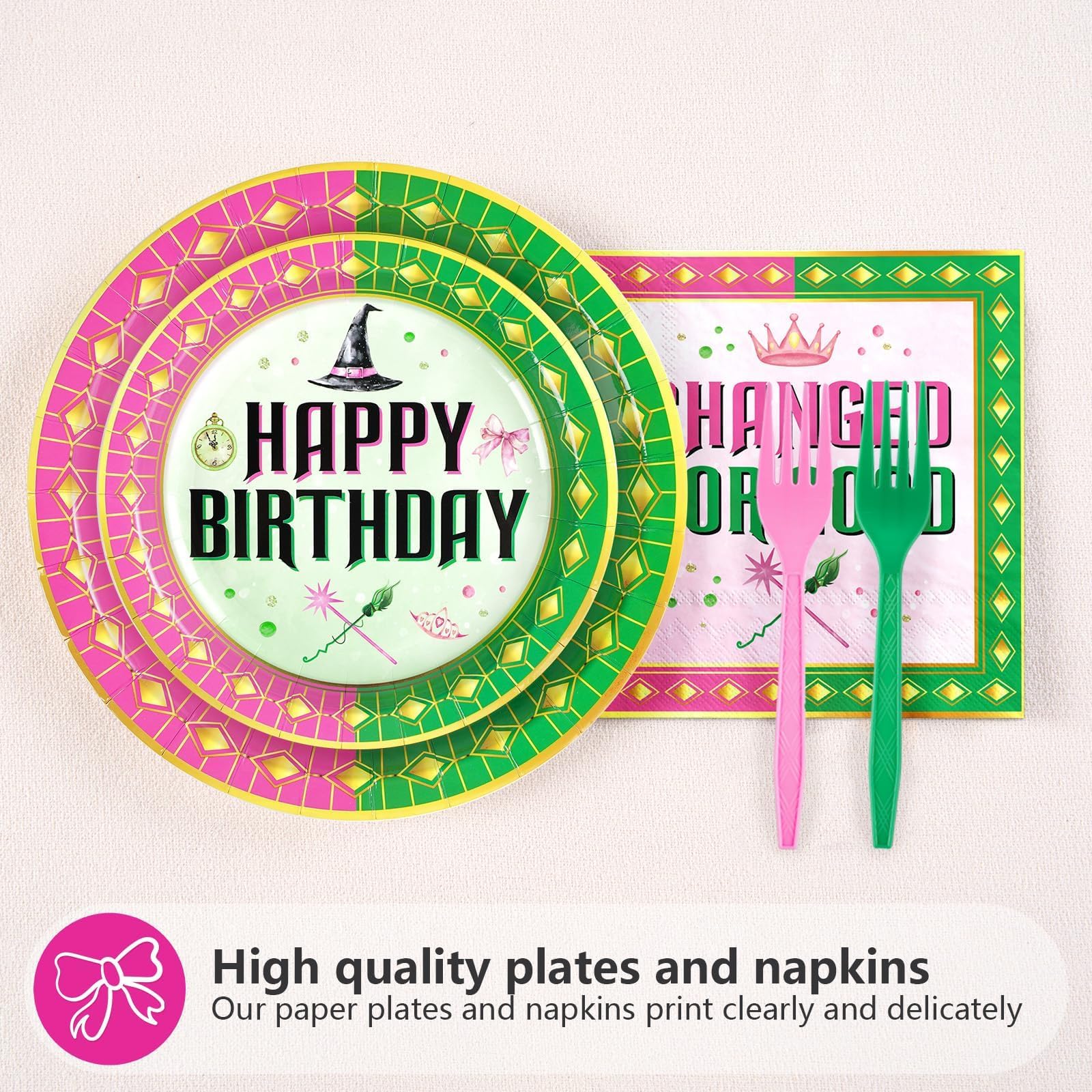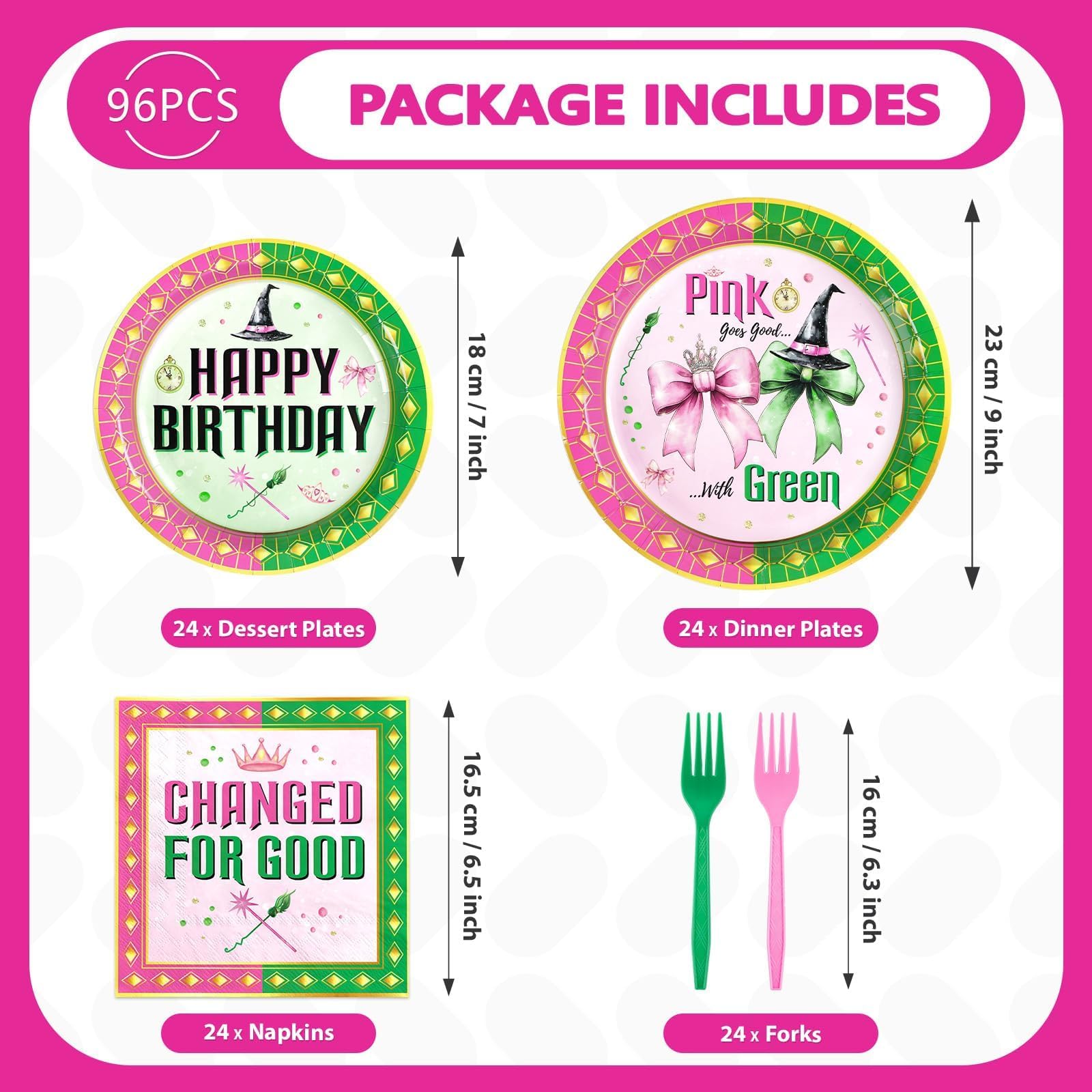 【Witch Birthday Party Supplies】 Our 96 piece witch birthday party plates include 24 9inch pink and green dinner plates, 24 7 inch happy birthday dessert plates, 24 6.5 inch pink and green napkins, and 24 pink and green forks, each set can accommodate 24 guests. This witch plates and napkins are designed specifically for happy birthday and will bring the perfect birthday party experience
