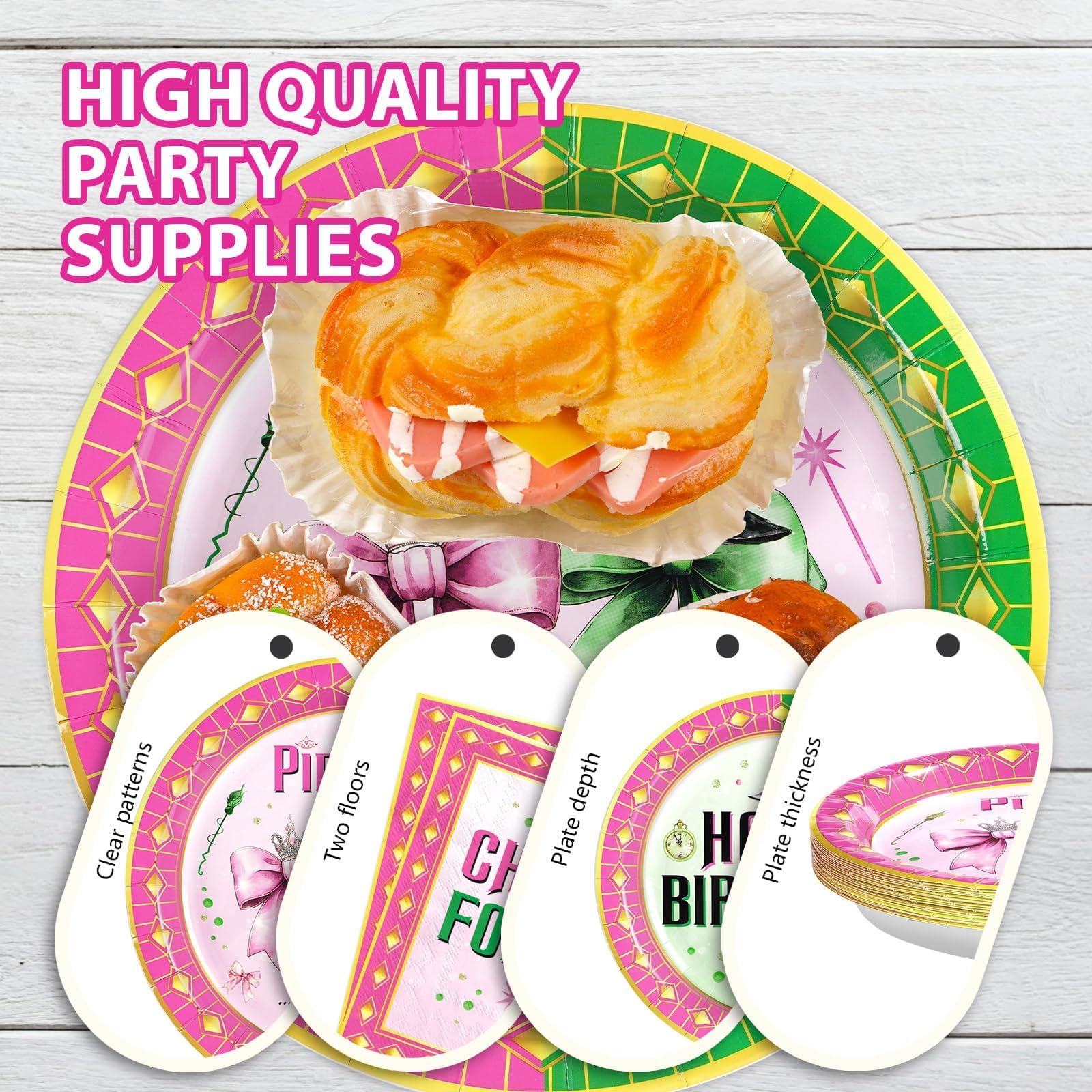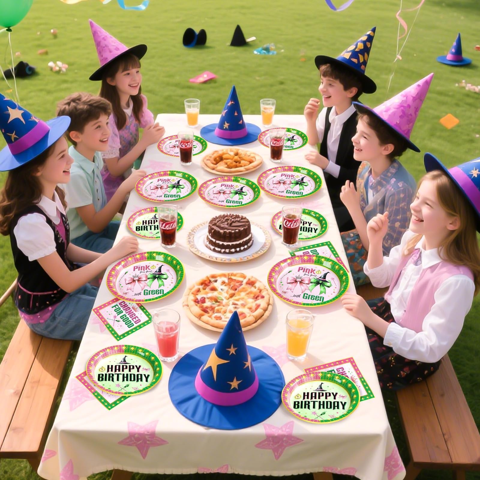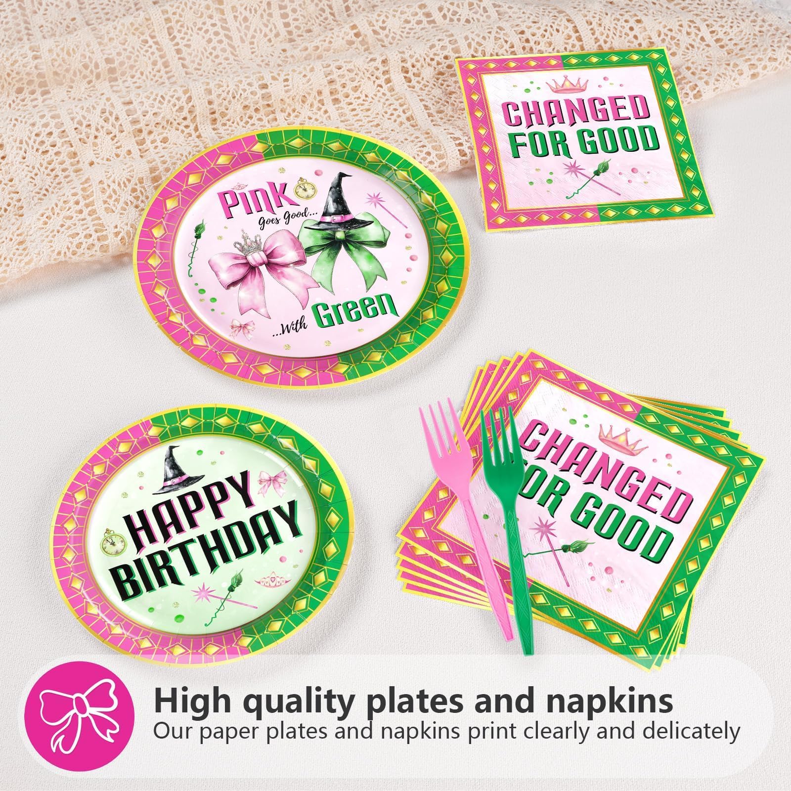 【Witch Birthday Party Supplies】 Our 96 piece witch birthday party plates include 24 9inch pink and green dinner plates, 24 7 inch happy birthday dessert plates, 24 6.5 inch pink and green napkins, and 24 pink and green forks, each set can accommodate 24 guests. This witch plates and napkins are designed specifically for happy birthday and will bring the perfect birthday party experience