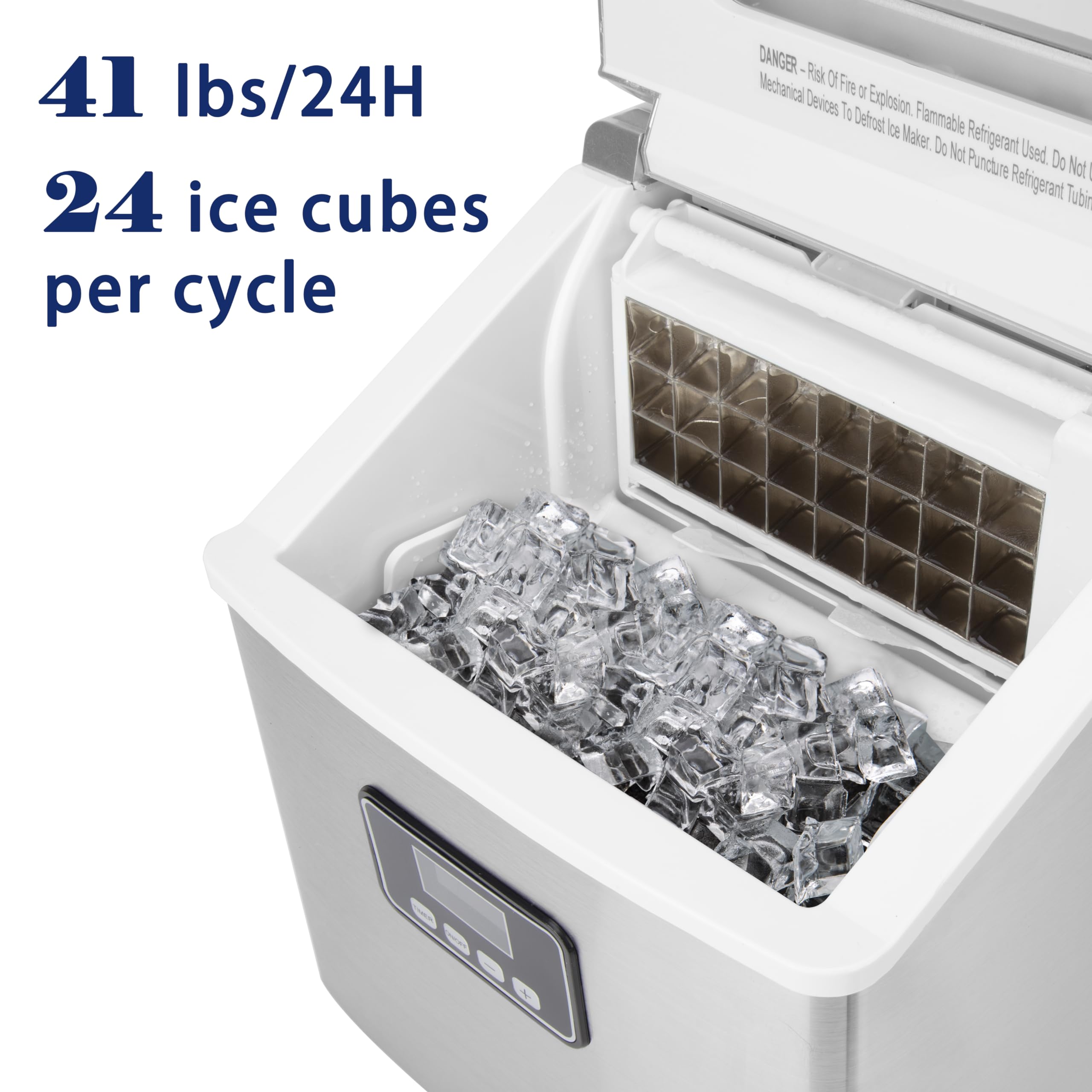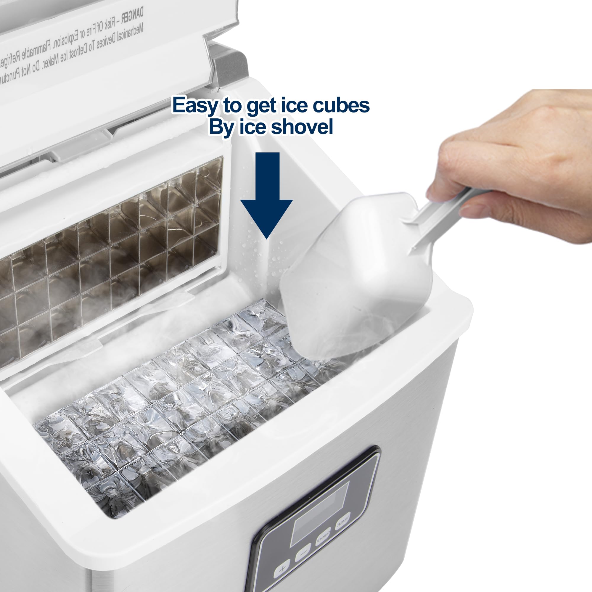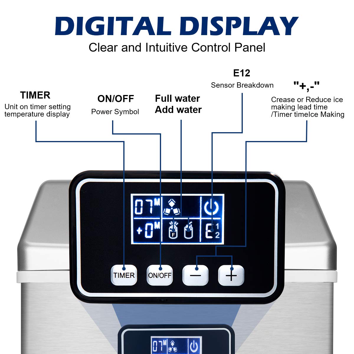 LCD & DIGITAL DISPLAY - Electronic controls for ease of use. Features an easy-to-read push-button digital design for comfortable use. Timer with up to 8-hour delay. Offers on-time ice production. When there is not enough water in the water tank, the indicator will light up, reminding you to add more water. Or when the ice bucket is full, the ice maker will remind you to remove the extra ice cubes, so the ice maker can start to make more ice.