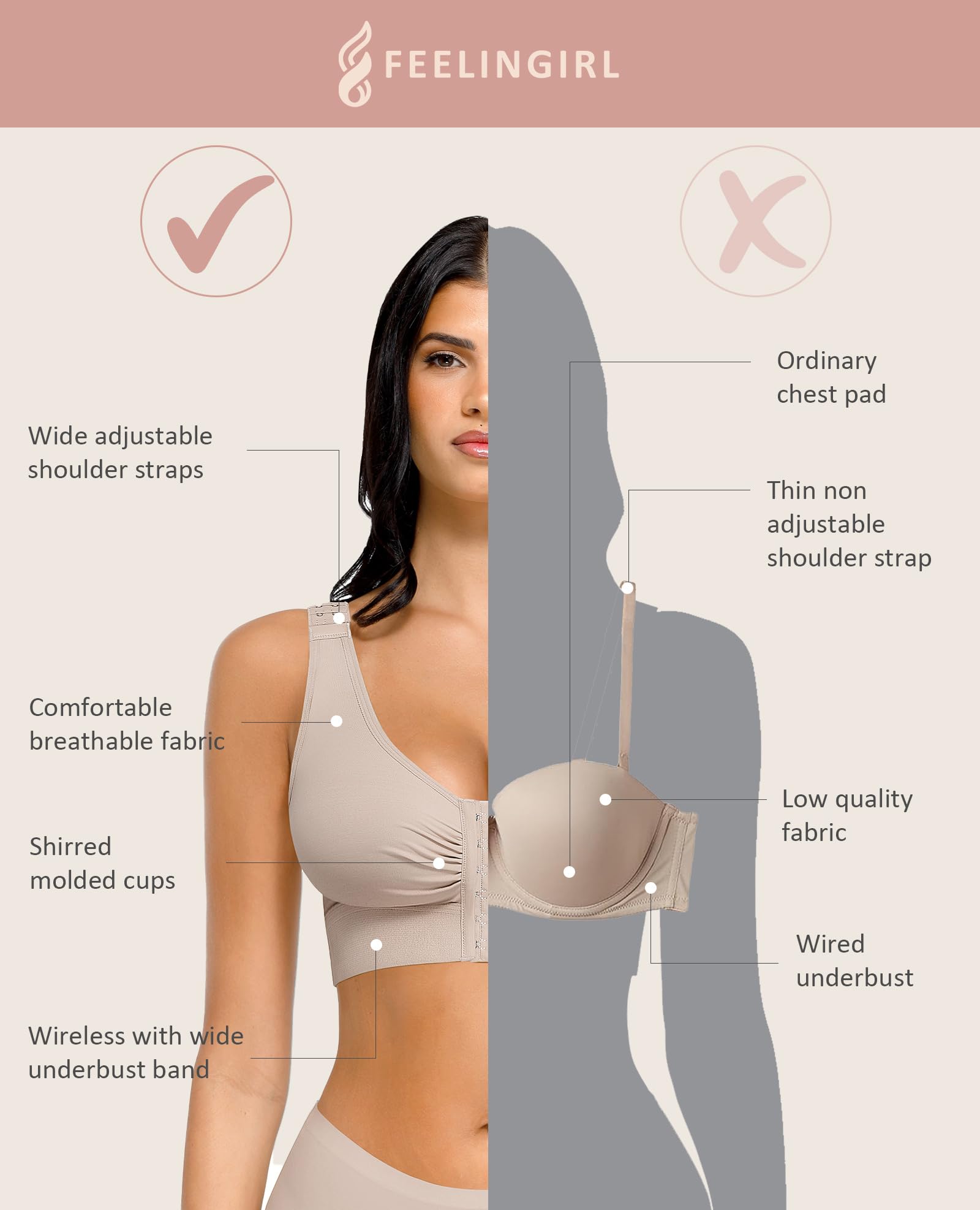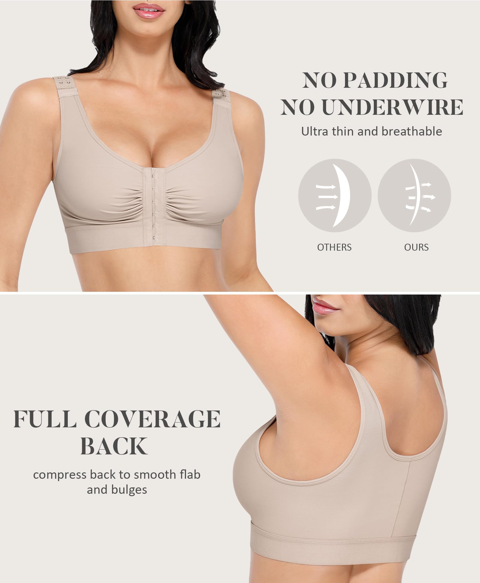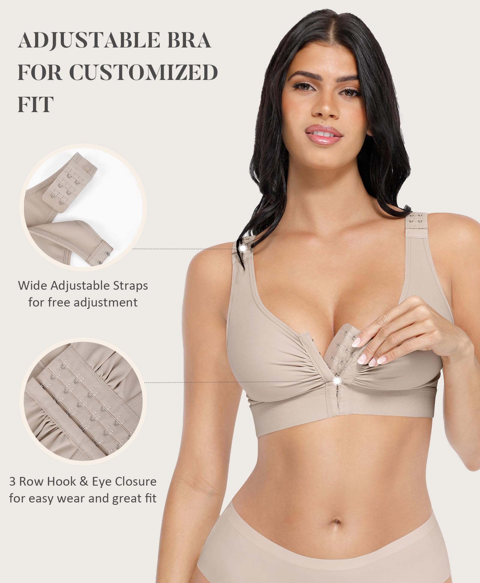EASY ADJUSTMENT: This women's front closure bra can be adjusted in multiple ways to accommodate various cup sizes, including three rows of hook-and-eye closures in the front and shoulder closures for full adjustability. It is easy to wear, and you can adjust the compression level as needed at any time.