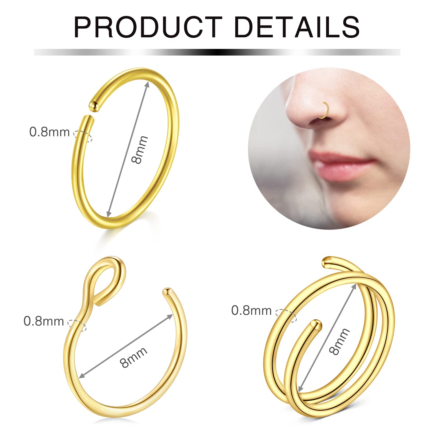 [Product Size] -- Gauge Size:20G (0.8mm),Stud Piercing, Bar Length:7mm, CZ Size:2-4mm,Nose Rings Hoops Inner Diameter:8mm.Color: Gold. Different size suit for all the people. These nose rings for women are easy to insert and off.