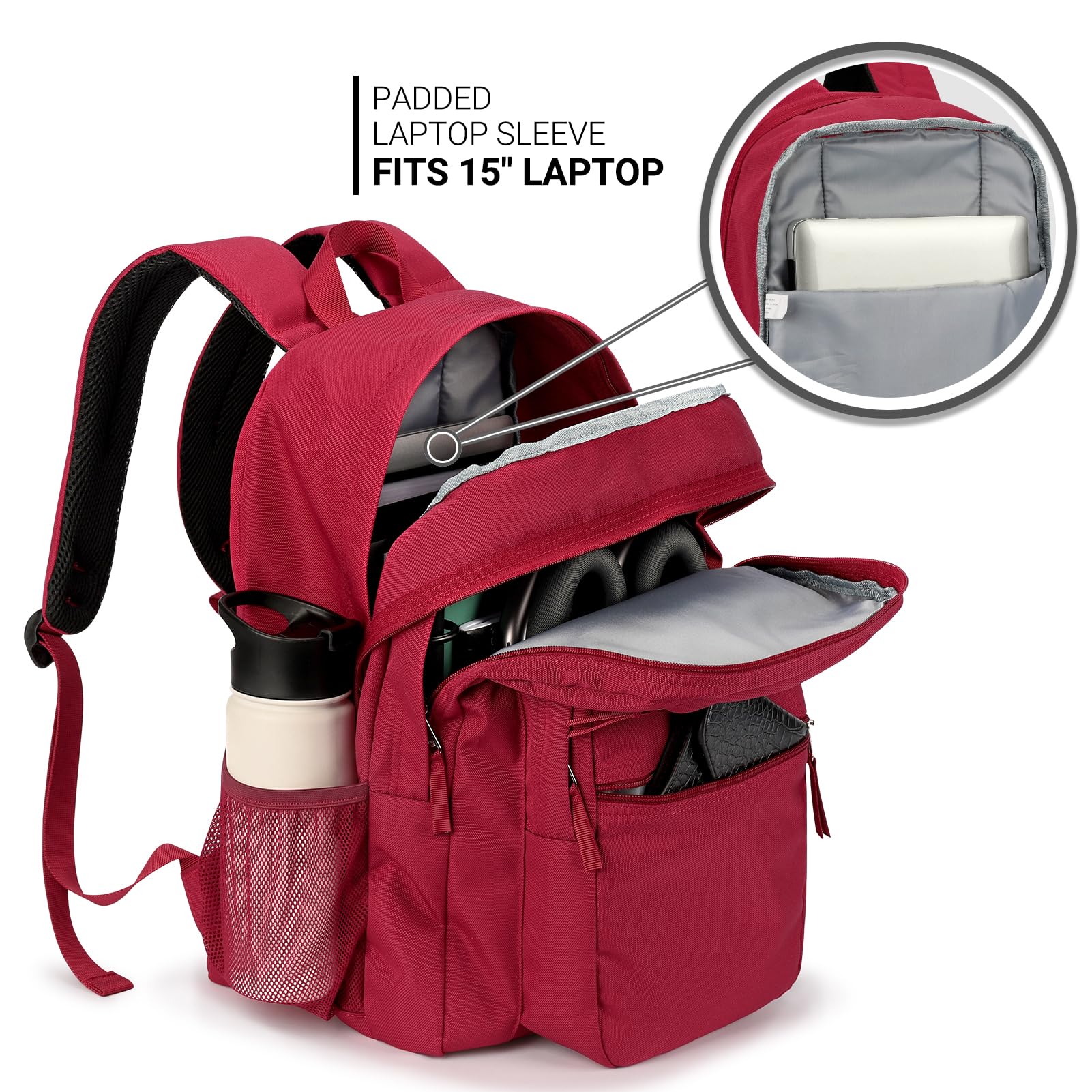 Convenient Storage Backpack: Our unisex laptop backpack features two main compartments, including a dedicated laptop sleeve for up to 15.6" devices. It also boasts a discrete front stash pocket, a utility pocket with an integrated organizer, and an additional external zippered pouch for quick access. Plus, two side pockets accommodate various water bottle sizes.
