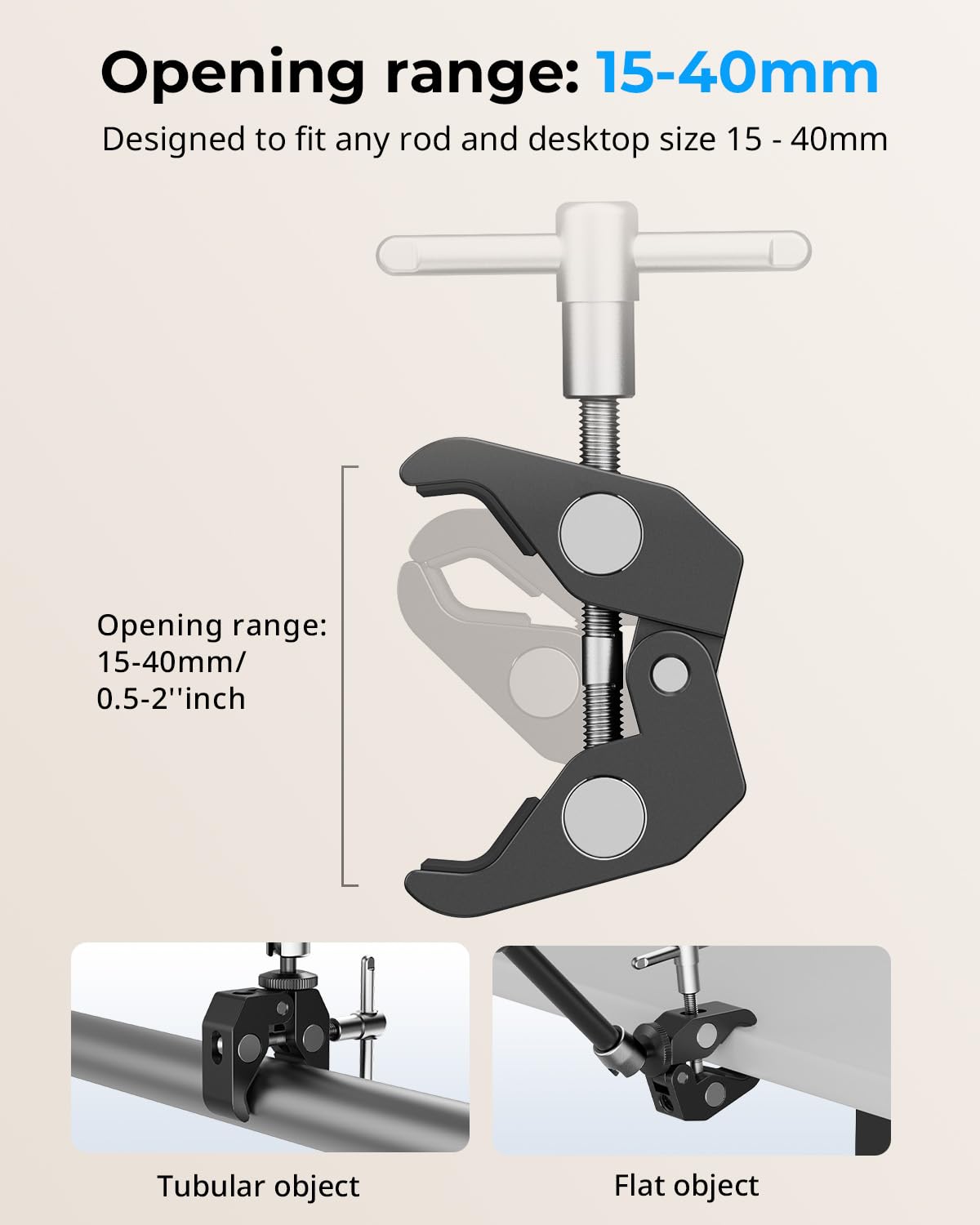 【SUPER CLAMP】This super cool clamp was made of lightweight aluminum alloy, comes with 1/4"-20 and 3/8"-16 thread and can be mounted virtually anywhere, such as cameras, lights, umbrellas, hooks, shelves, plate glass, cross bars, even other Super Clamps. It can open maximum 54mm and minimum 15mm