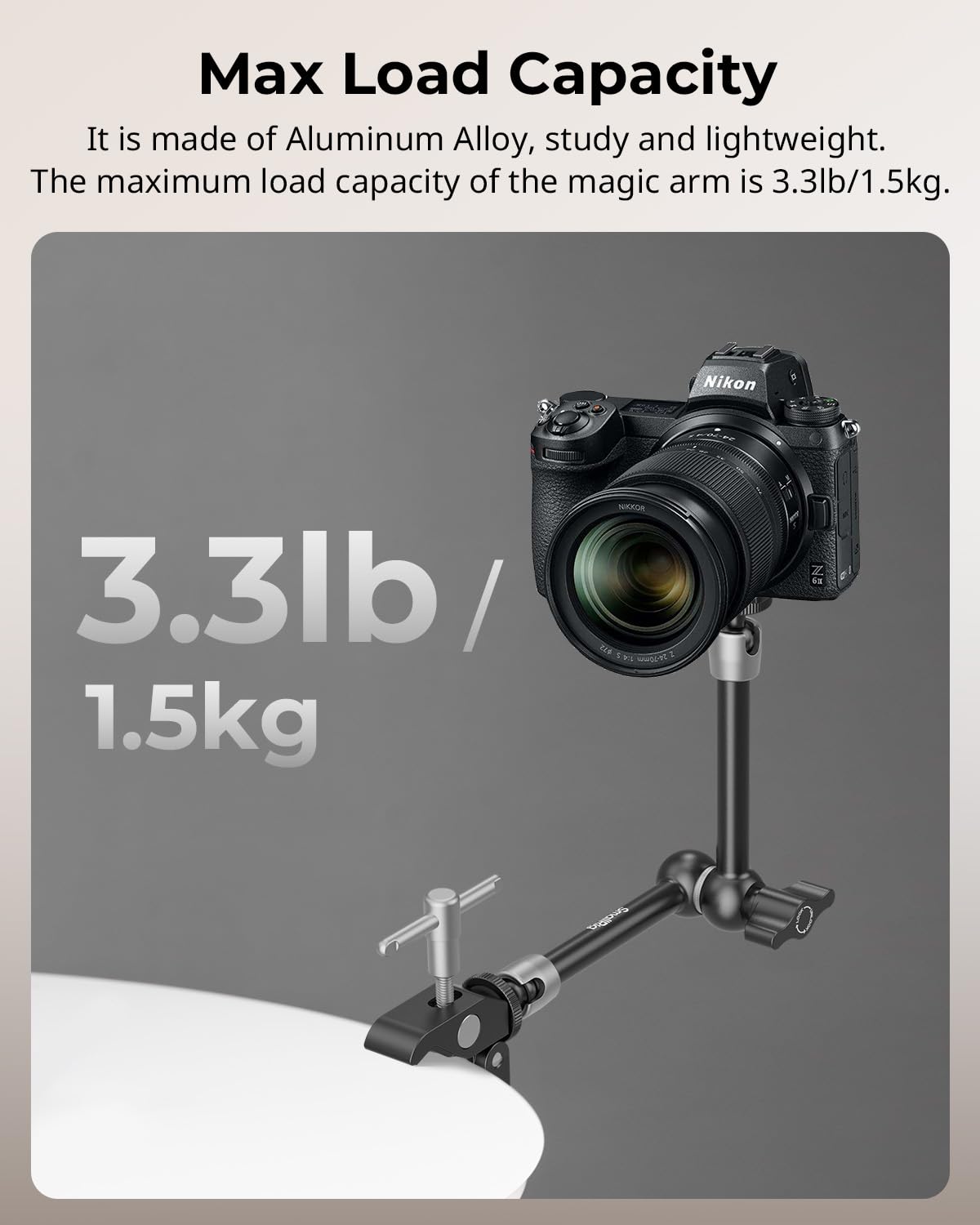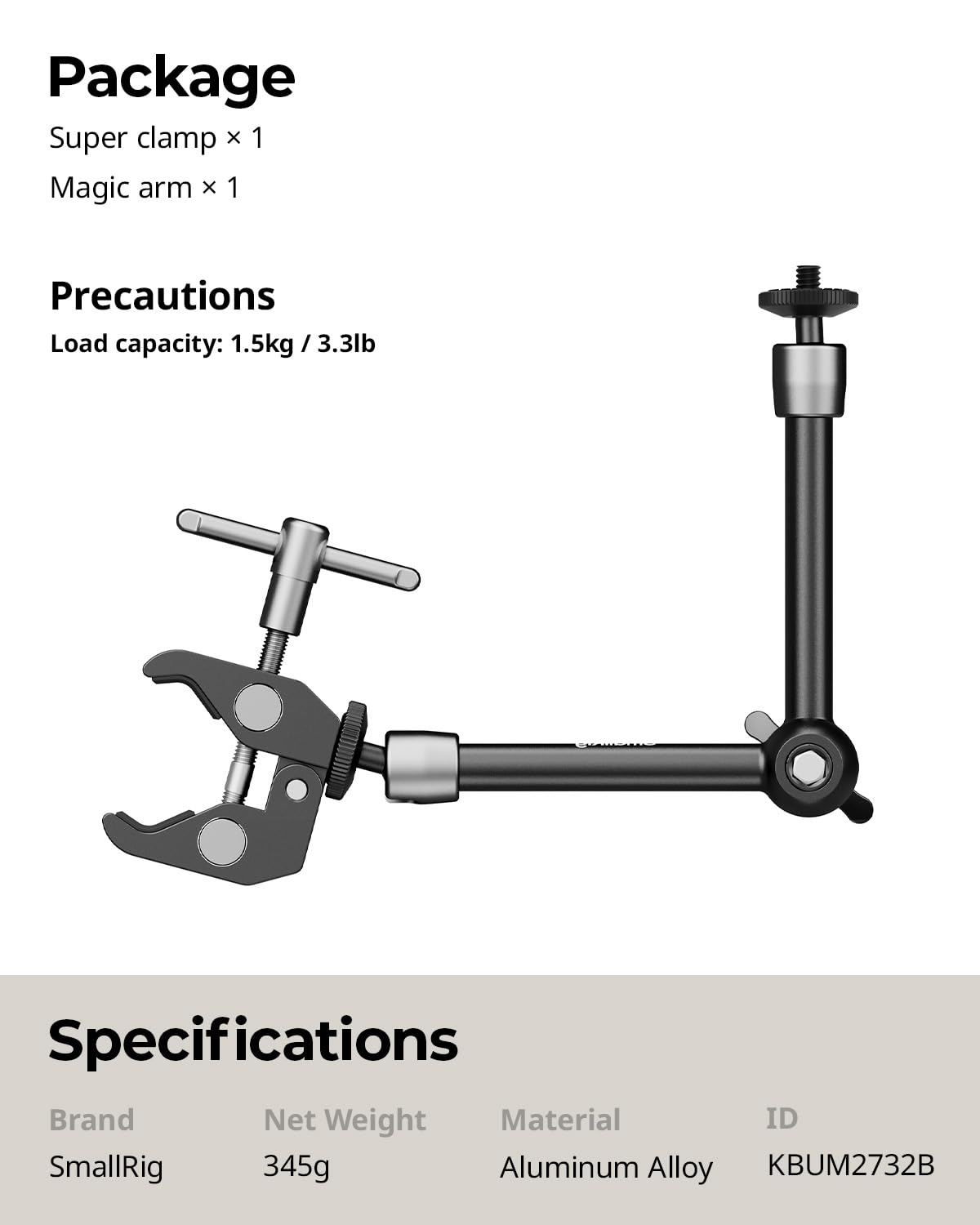 【VERSATILITY】SmallRig 2732 comes with a super clamp with 1/4" and 3/8" threads and an articulating arm with 1/4” screws on both ends respectively. The length of the magic arm is 9.8 inches/25 cm.
