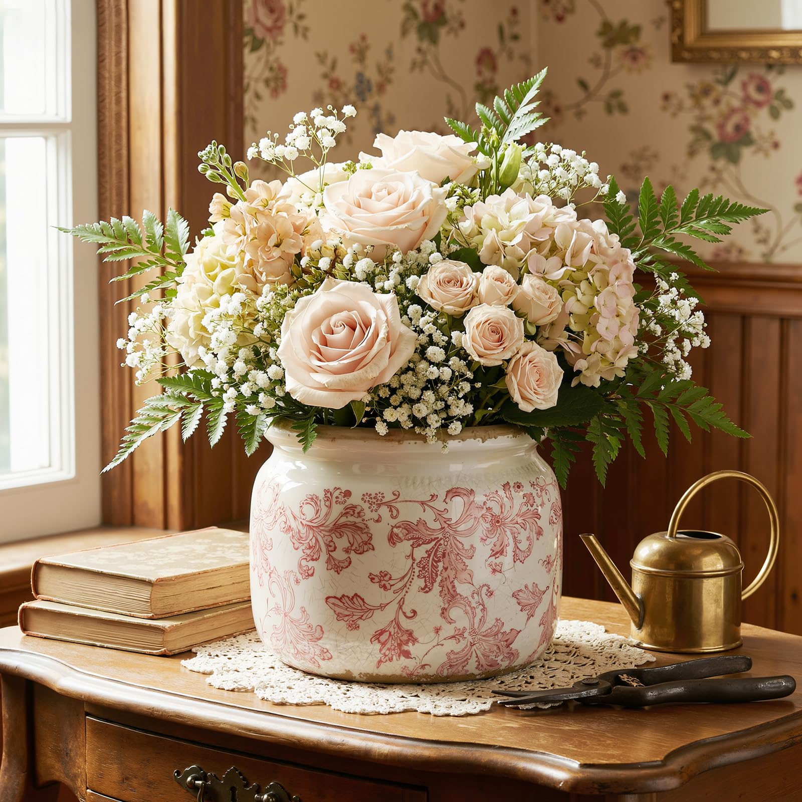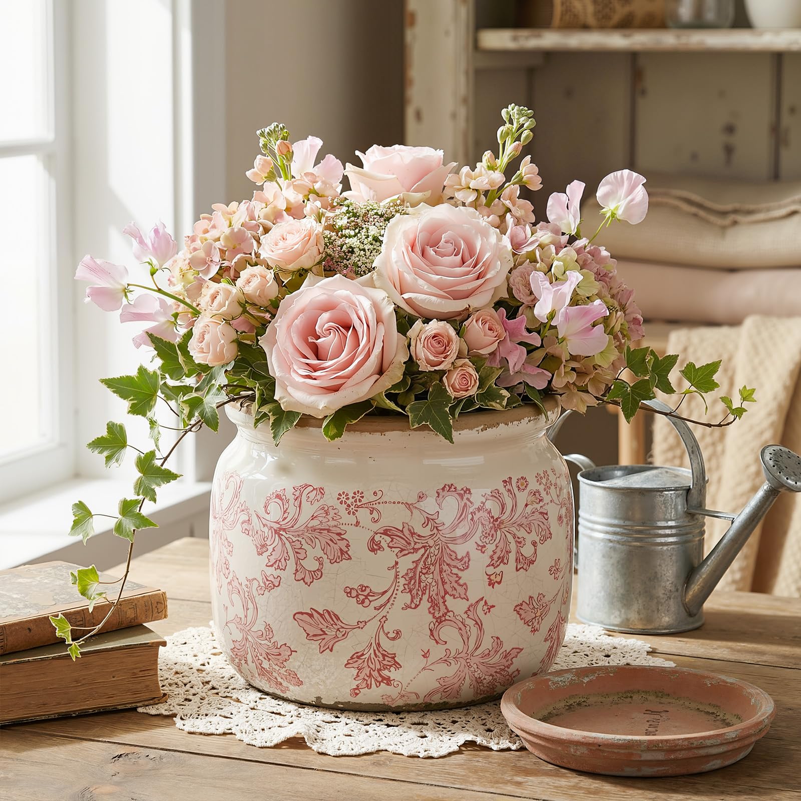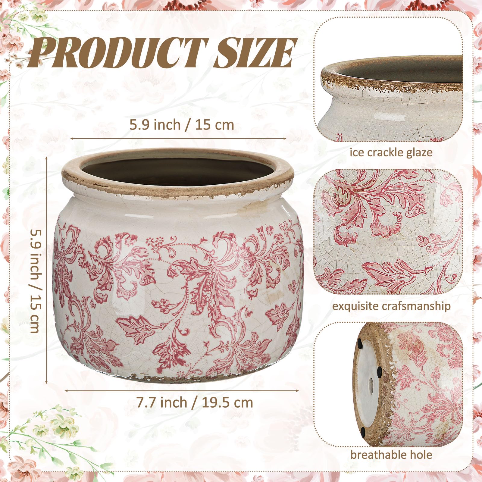 Elegant Vintage Floral Design: This ceramic plant pot features a charming beige background with delicate pink floral patterns, adding a timeless touch to any space. The unique crackle glaze finish creates a vintage, handcrafted look that complements both rustic and modern interiors, making it a standout decorative piece