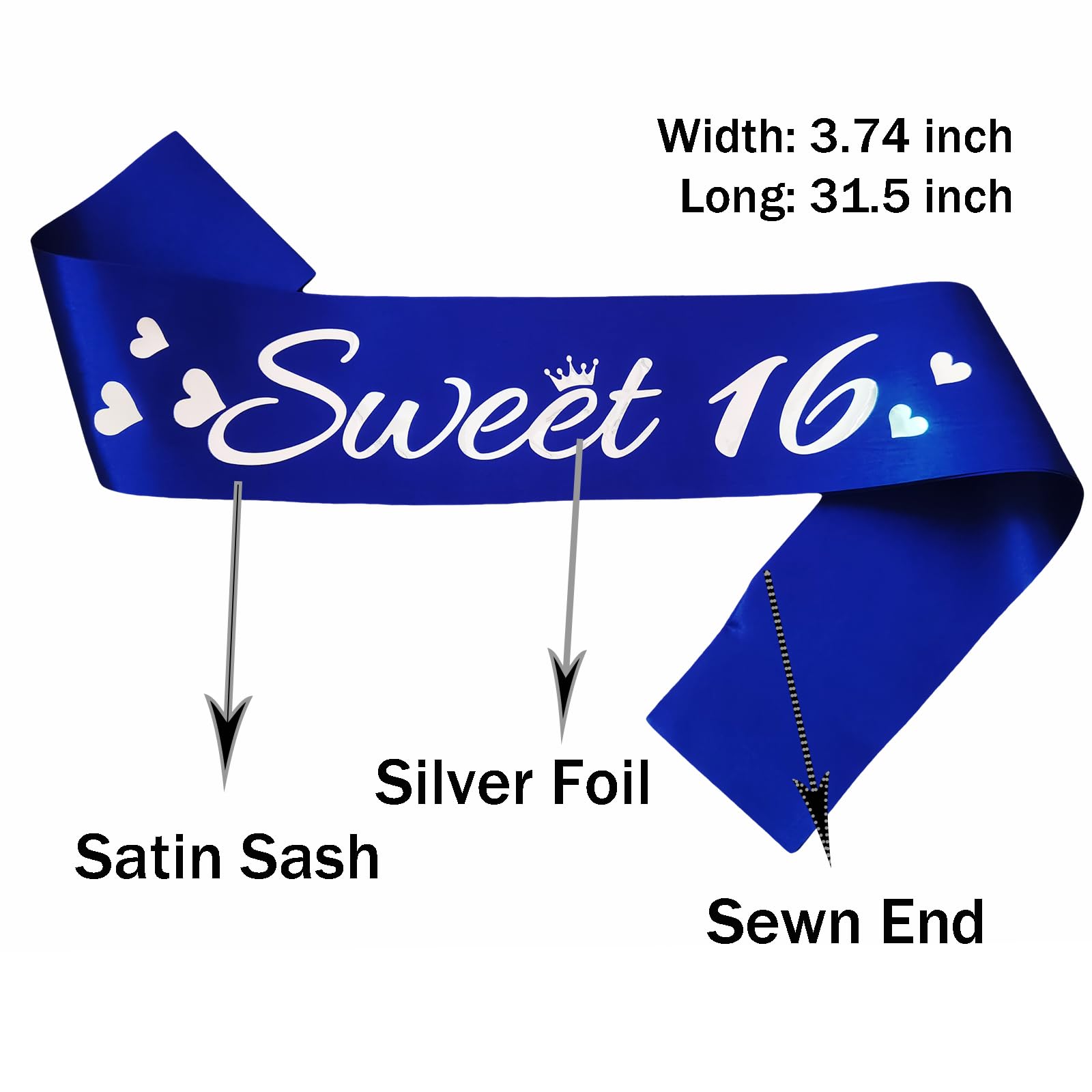 LXYXUUN Sweet 16 Sash Royal Blue, Silver Foil Birthday Sash for 16th Funny Birthday Party Decorations, Girl Sweet 16 Bday Sash Gift Ideas