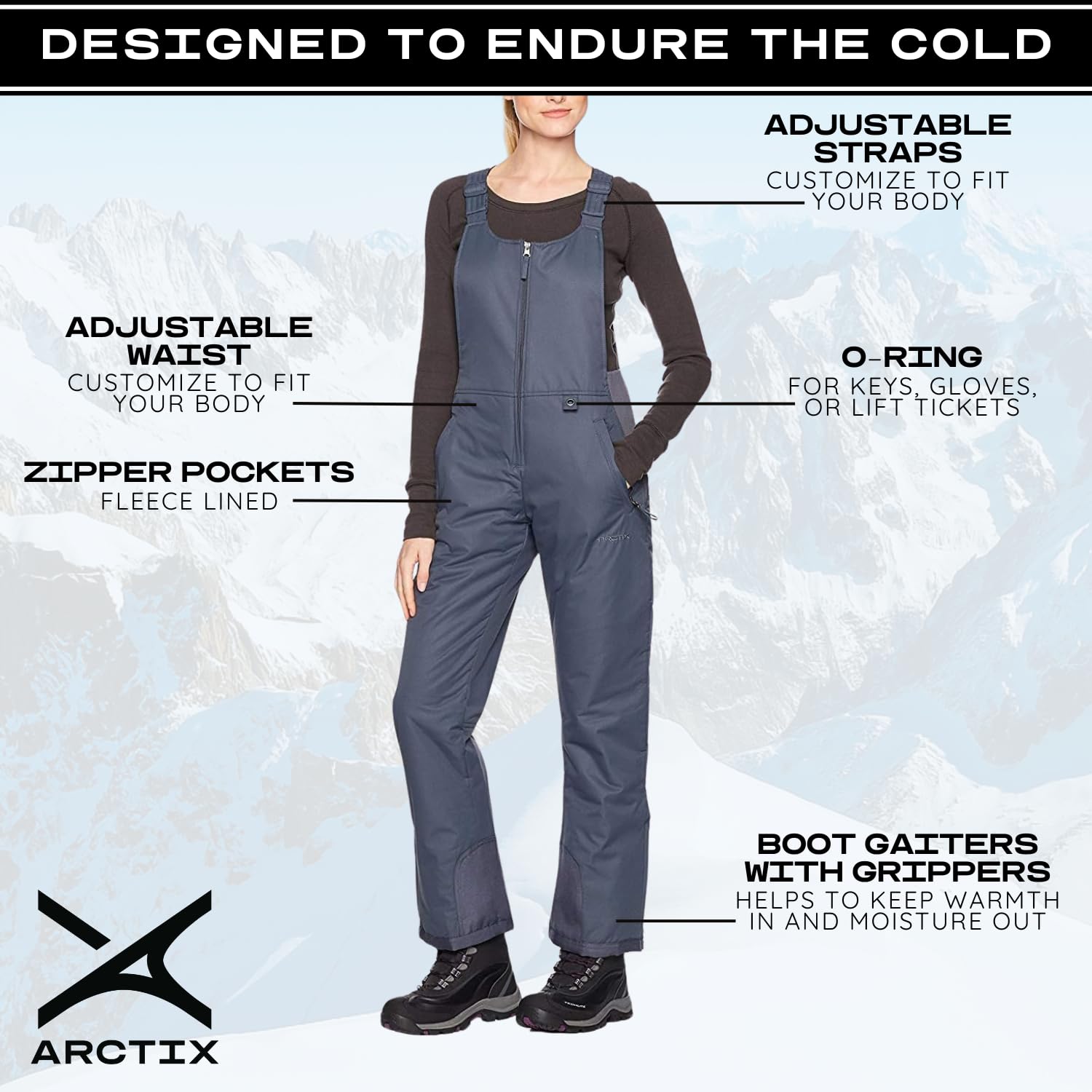 ADDED FEATURES: Fleece-Lined Hand Warmer Zip Pockets for added security; O-ring for keys, gloves, and lift tickets; Boot Gaiters with Grippers form a seamless integration with boots to keep the warmth in and moisture out.