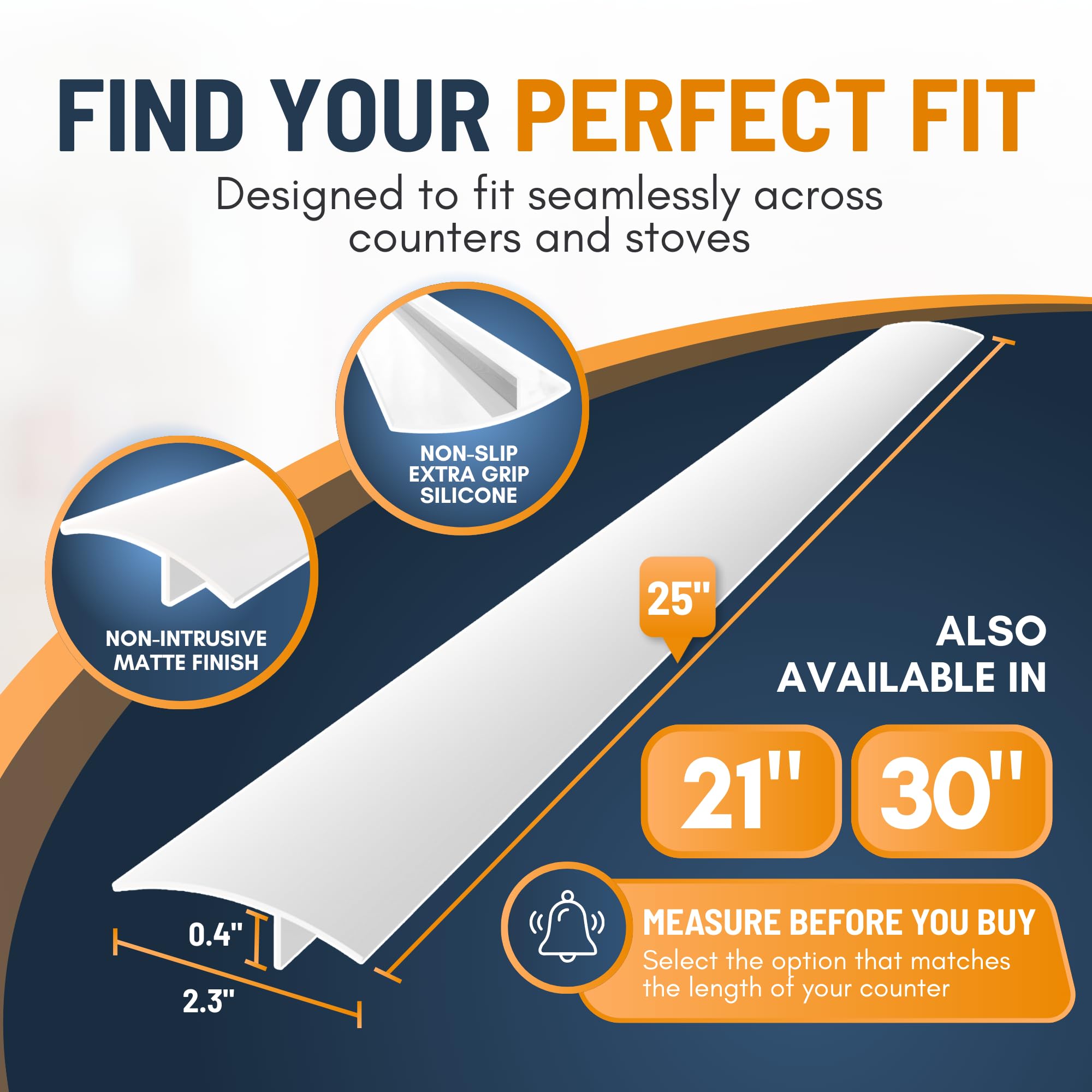 SIMPLE TO INSTALL: Our universal 25 inch stove gap guard sit perfectly in place on all stovetops. The non-slip flexible silicone conforms to your stove and counter surfaces and adapts to any uneven spaces. Easily customize to your stove by cutting to size using scissors
