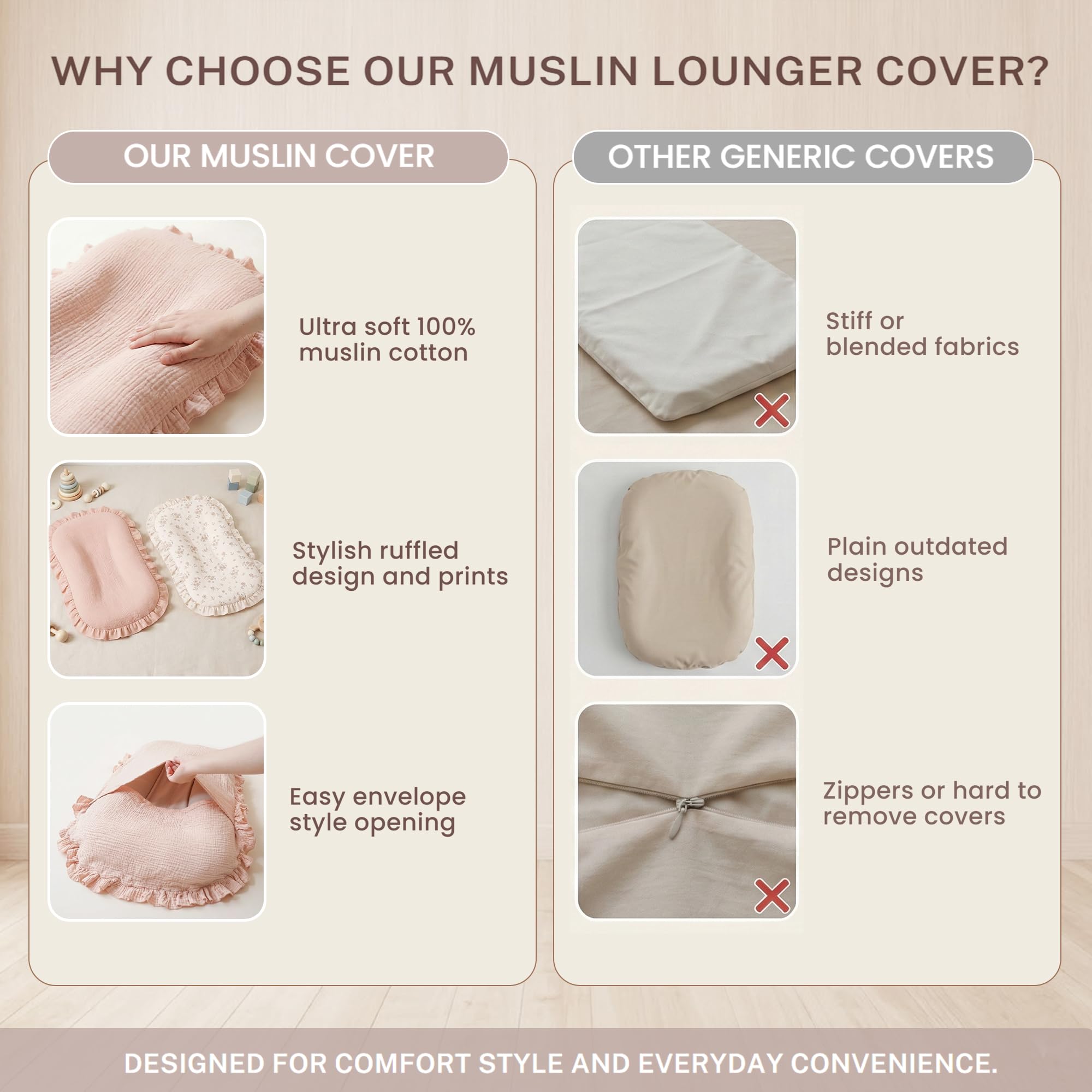 2-Pack Covers Only: Each set includes baby lounger covers only. Please note that these covers are designed exclusively for the lounger and do not come with the lounger itself. These soft, neutral-colored covers with delicate patterns add a charming touch to your baby's lounger, providing a perfect fit designed just for it