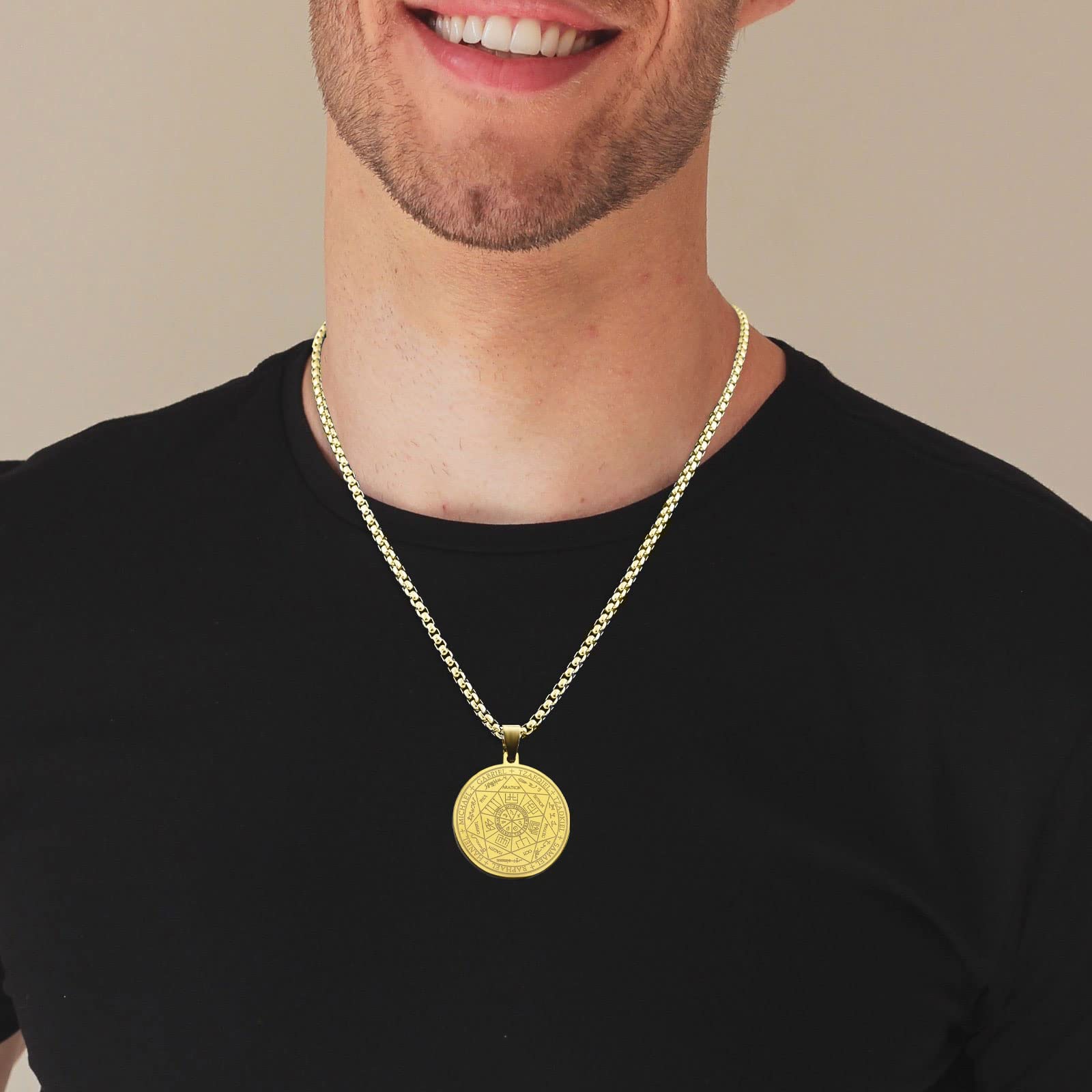 【Perfect Materials and Workmanship】The medal is made from 316L stainless steel which with Etching or laser marking by better technology on the surface, entirely hypoallergenic and comfort fit. There is a wonderful depiction of Seal Of Seven Archangels as well.