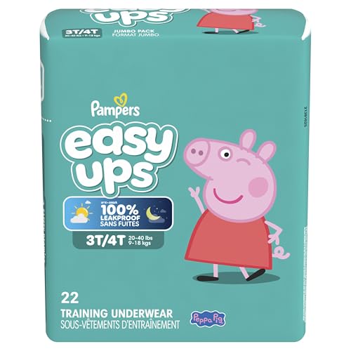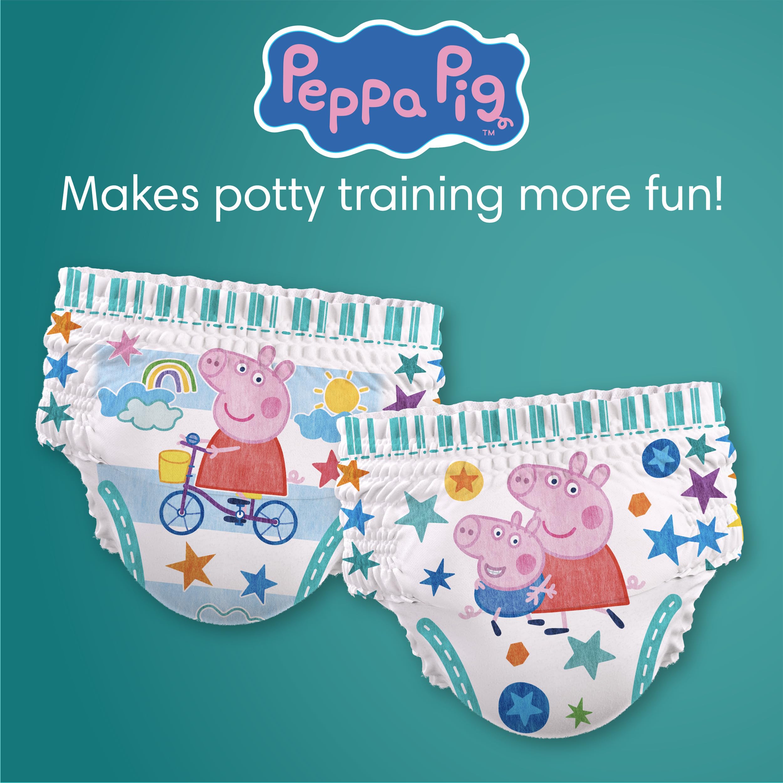 Ready to potty train with Peppa? Pampers Easy Ups Training Pants featuring Peppa Pig makes it easy. They pair the feeling of real underwear with the protection of Pampers to make potty training easier for everyone. Give your child the confidence to take on potty training with a little more independence and a lot more fun. Easy Ups Training Pants feature stretchy sides and an underwear-like waistband for easy pull up and down, plus an ultra-absorbent core with LockAway Channel to help keep them dry day and night. With up to 2X better protection day and night*, Easy Ups training pants deliver up to 100% leakproof protection. These hypoallergenic, dermatologist-approved pull ups are made with 0% elemental chlorine, parabens, or latex** and backed by the Pampers Safety Promise. Fun Peppa designs motivate your toddler to potty train. Pampers Easy Ups training pants are also available with Bluey! Pair with Pampers Sensitive Wipes to help keep your toddler's skin healthy. Find your toddler’s best fit in the following sizes: training pants 2T–3T (diaper size 4,15–34 lbs.), training pants 3T–4T (diaper size 5, 20–40 lbs.), training pants 4T–5T (diaper size 6, 23-50 lbs.), training pants 5T–6T (diaper size 7, 35–60 lbs.), training pants 6T–7T (diaper size 8, 46+ lbs.) *Urine leaks vs. leading competitor size 2T-3T ** No natural rubber †Pricing based on MSRP; excludes Easy Ups Jumbo. Pricing at the sole discretion of the retailer