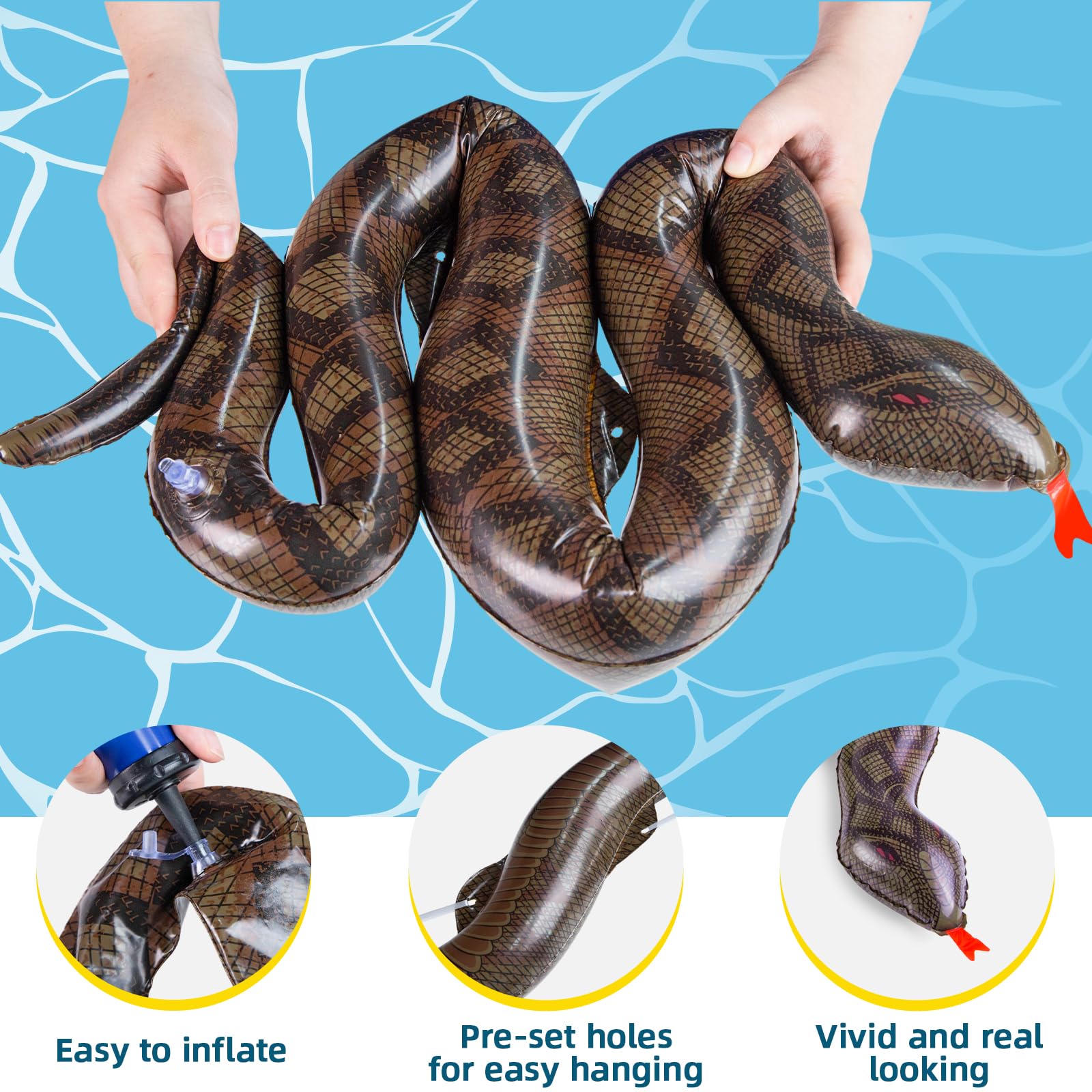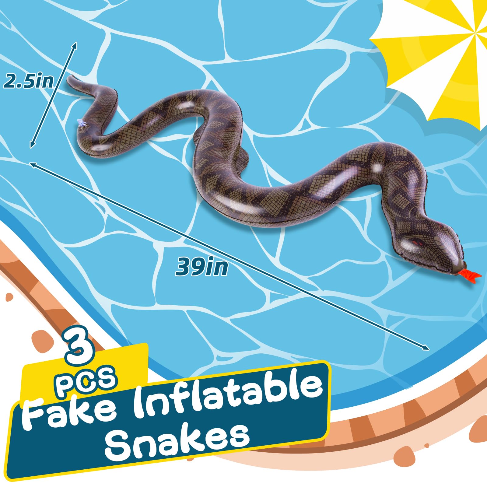 Super Value Pack - Our set includes 3 large dark brown inflatable snakes (39" long), crafted from durable and reusable high-grade PVC material. When not in use, simply deflate snakes for easy storage, ensuring these pool floats can be enjoyed for years to come.