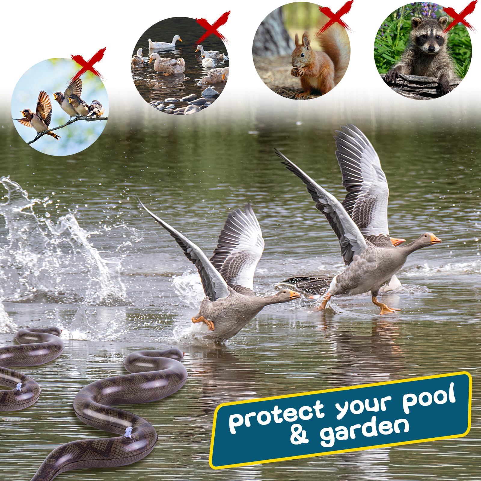Realistic and Eye-Catching - Our inflatable snakes boast vivid skins, menacing eyes, and a red forked tongue, making them virtually indistinguishable from real snakes, even from a distance. With lifelike appearance, these inflatable snakes effectively deter animals, ensuring your pool, garden, and backyard remain free from pesky raccoons, rats, birds, and squirrels.