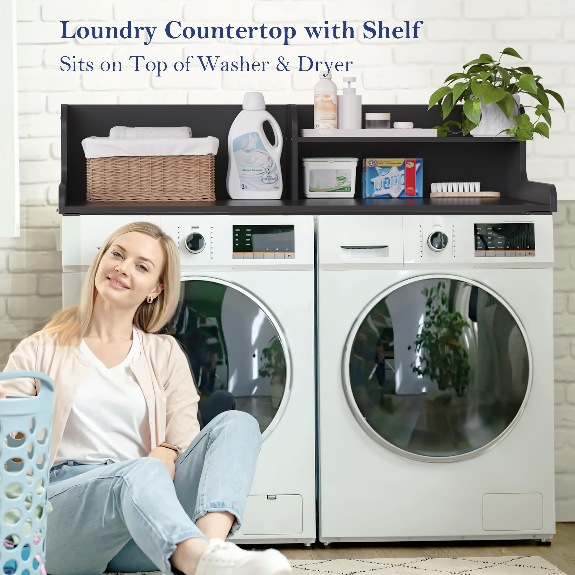 EFFICIENT STORAGE SOLUTION: We designed two spaces for different heights storage. The left side for taller items, such as laundry detergent and storage baskets and the right side with double-layer storage area for low items, such as laundry beads. Our washer dryer countertop is integrated with operation and storage, so you can not only have a large operating countertop, but also have extra storage space for diverse needs.