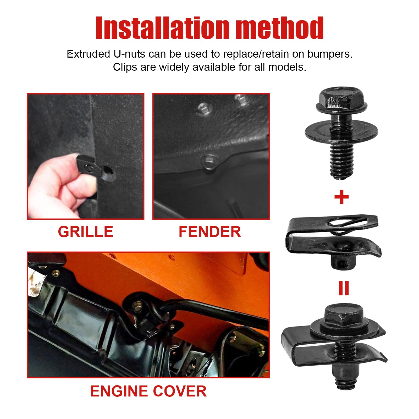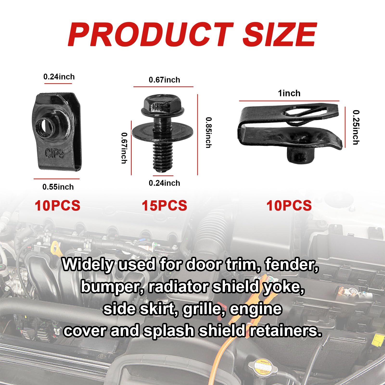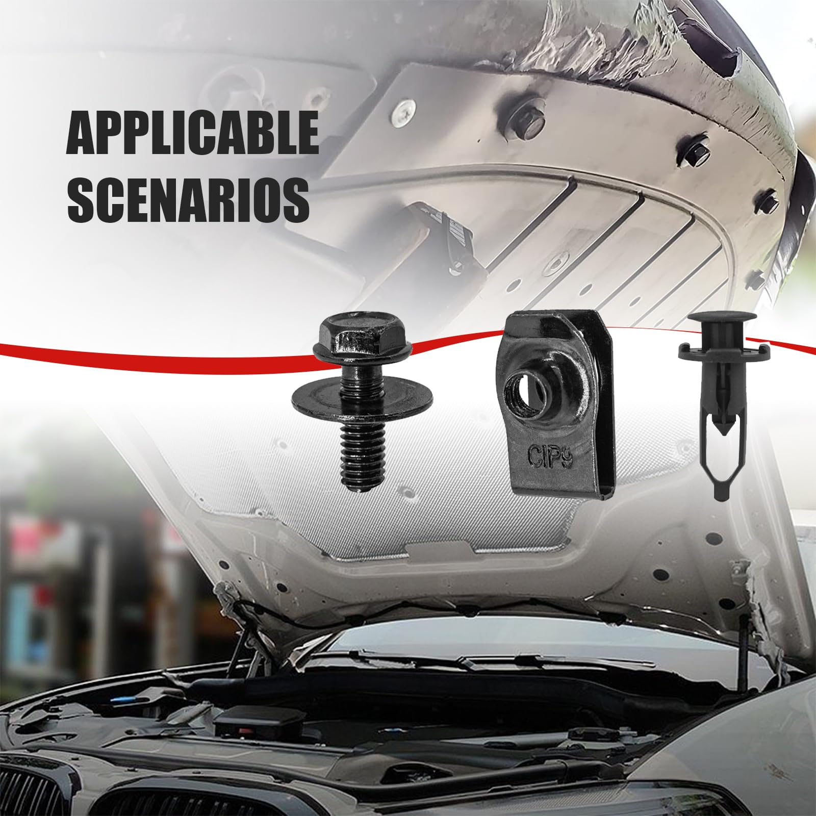 【High Quality】: This car's underhood splash guard body bolts are super sturdy and would not break or crack like other brands. These bumper clips are made of high-quality tough nylon and metal material with heavy-duty construction for durability, which has anti-water and anti-corrosion effects. So It is available for your long-term use without frequent replacement.