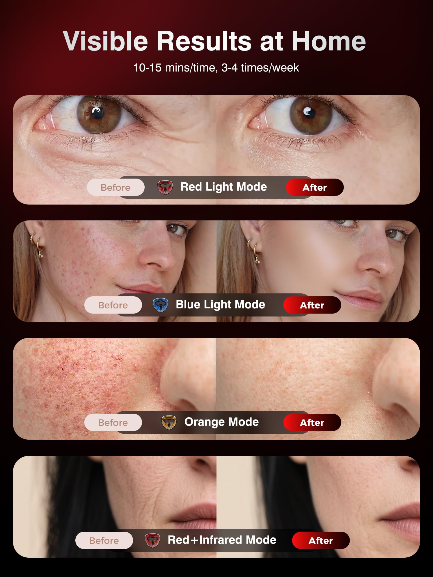 【4 Modes Red Light Therapy for Face】Red light (630nm) + near-infrared light (850nm), red light (630nm), blue light (460nm) and orange light (600nm) 4 light modes. The combination of red light and near-infrared light which is the best combination to increase skin elasticity and gloss. Skin care you can do at home saves you the time and money of going to a beauty salon. It is recommended to use 3-4 times a week.