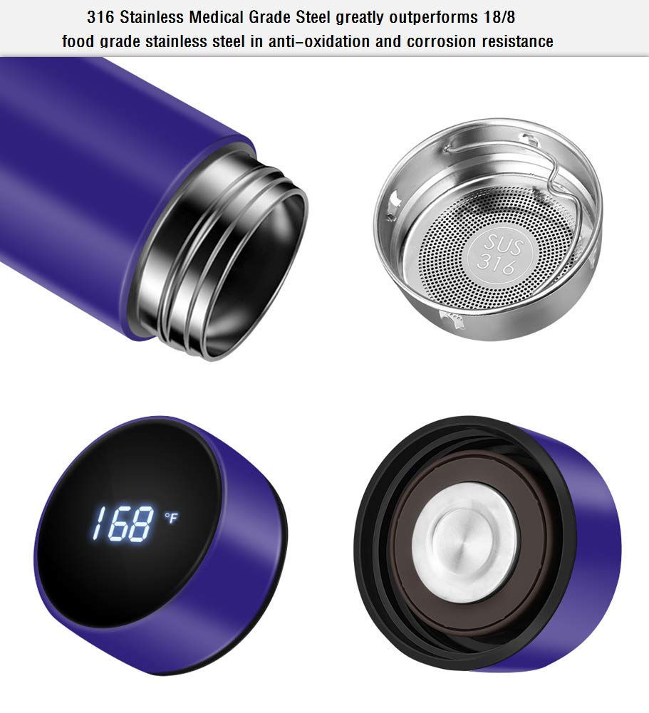 316 Stainless Medical Grade Steel----Insulated Water Bottle greatly outperforms 18/8 food grade stainless steel in anti-oxidation and corrosion resistance, it will never leave a metal taste or rust. Avoid the taste of the liquids to change (like tea, coffee and juice).