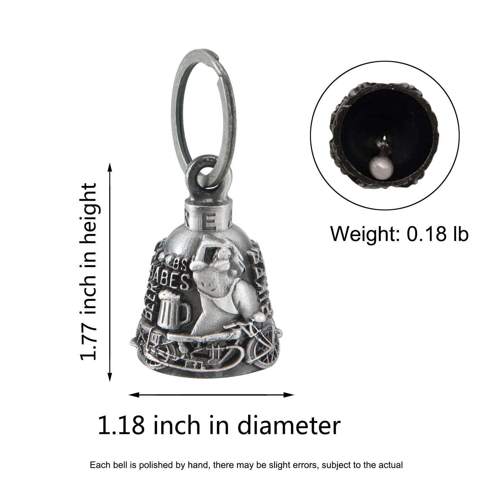 [Size] The motorcycle bell is 1.18 inch in diameter, 1.77 inch in height, and the clasp is 1.18 inch in diameter. The weight of the bell is 0.18 lb. You‘ll receive a motorcycle bell, a black hanger, a motorcycle bell legend note card, and a 2.75" x 3.62" velvet drawstring black bag. Various exquisite patterns are available according to your personal preferences.