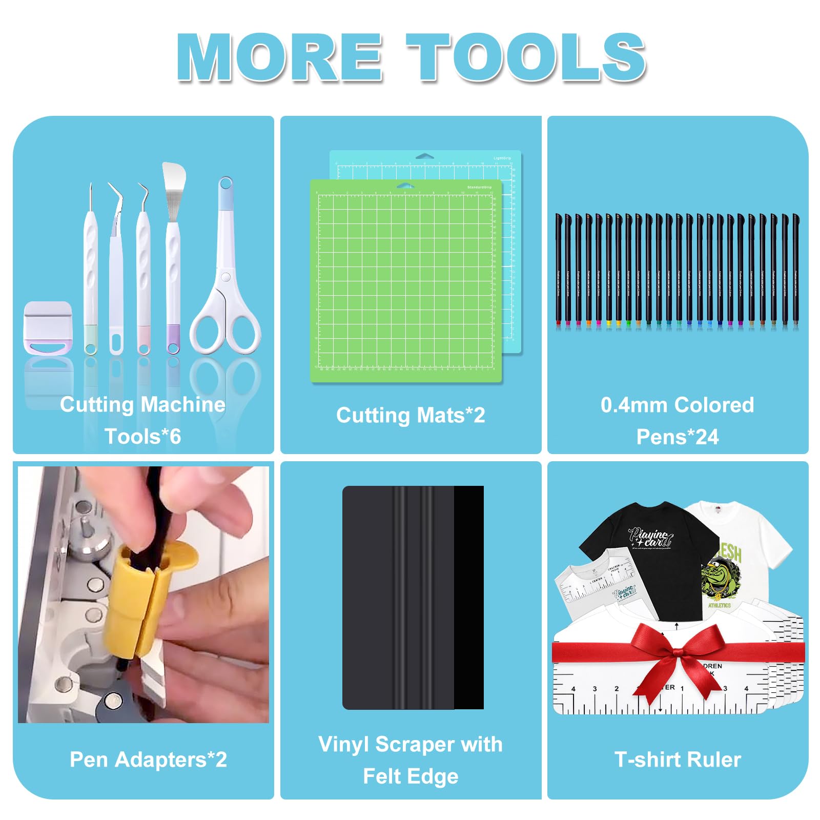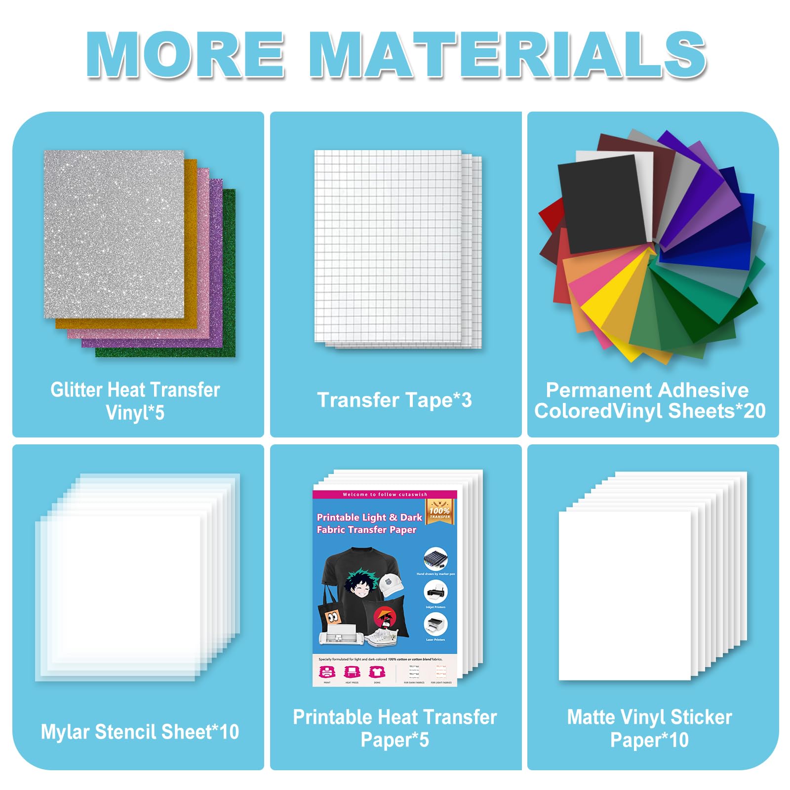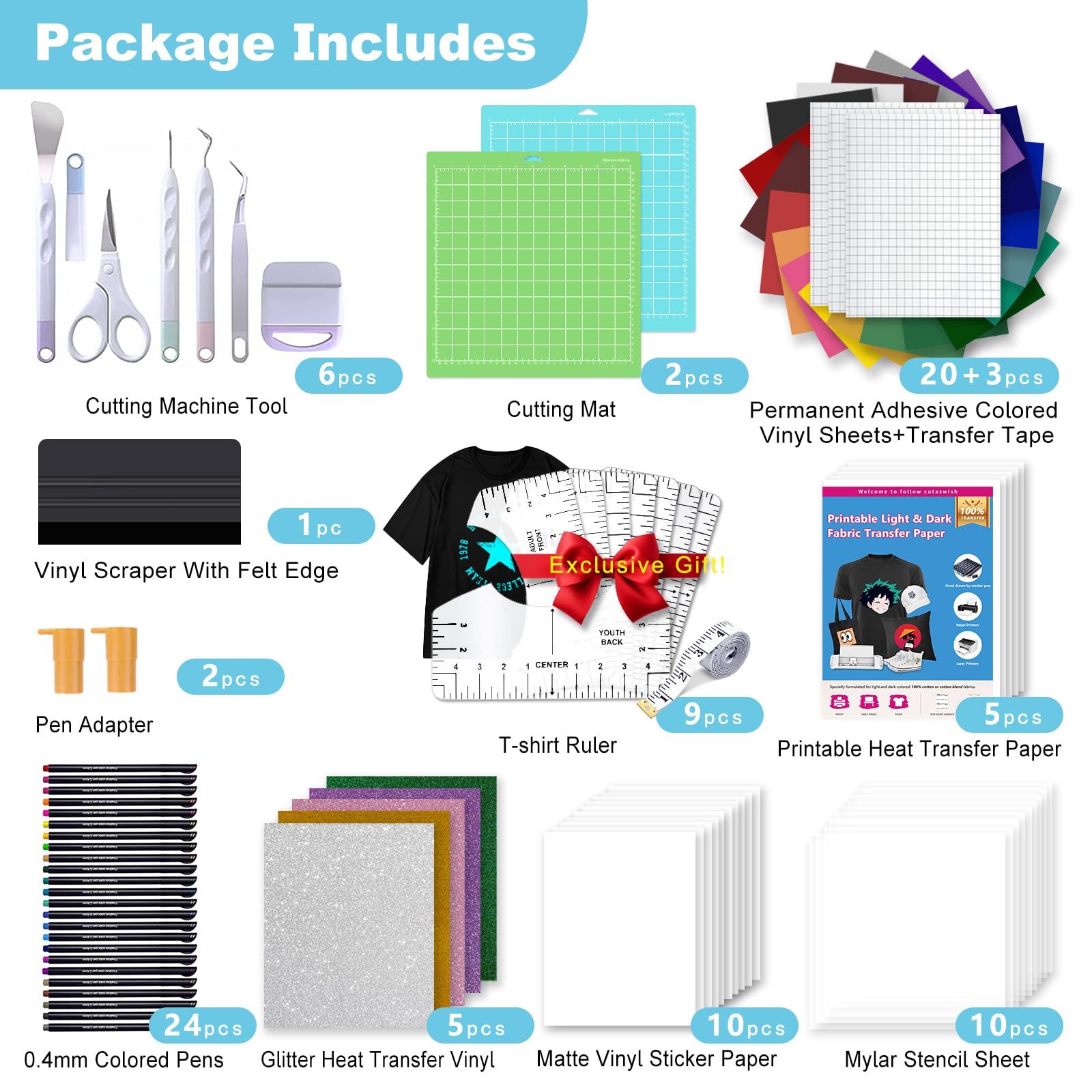 WHAT YOU WILL GET: Our all-in-one Accessories Bundle for cutting machine includes 1 package box, 5 glitter heat transfer vinyls, 20 permanent adhesive colored vinyl sheets, 3 transfer tapes, 10 mylar stencil sheets, 2 sticky cutting mat,10 matte vinyl sticker papers, 1 vinyl scraper, 2 pen adapters, 1 cutting machine tool kit,24x0.4mm colored pens and 1 printable light and Dark Fabric Transfer paper.