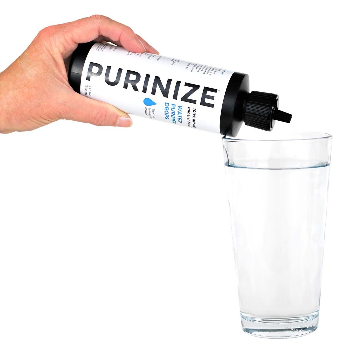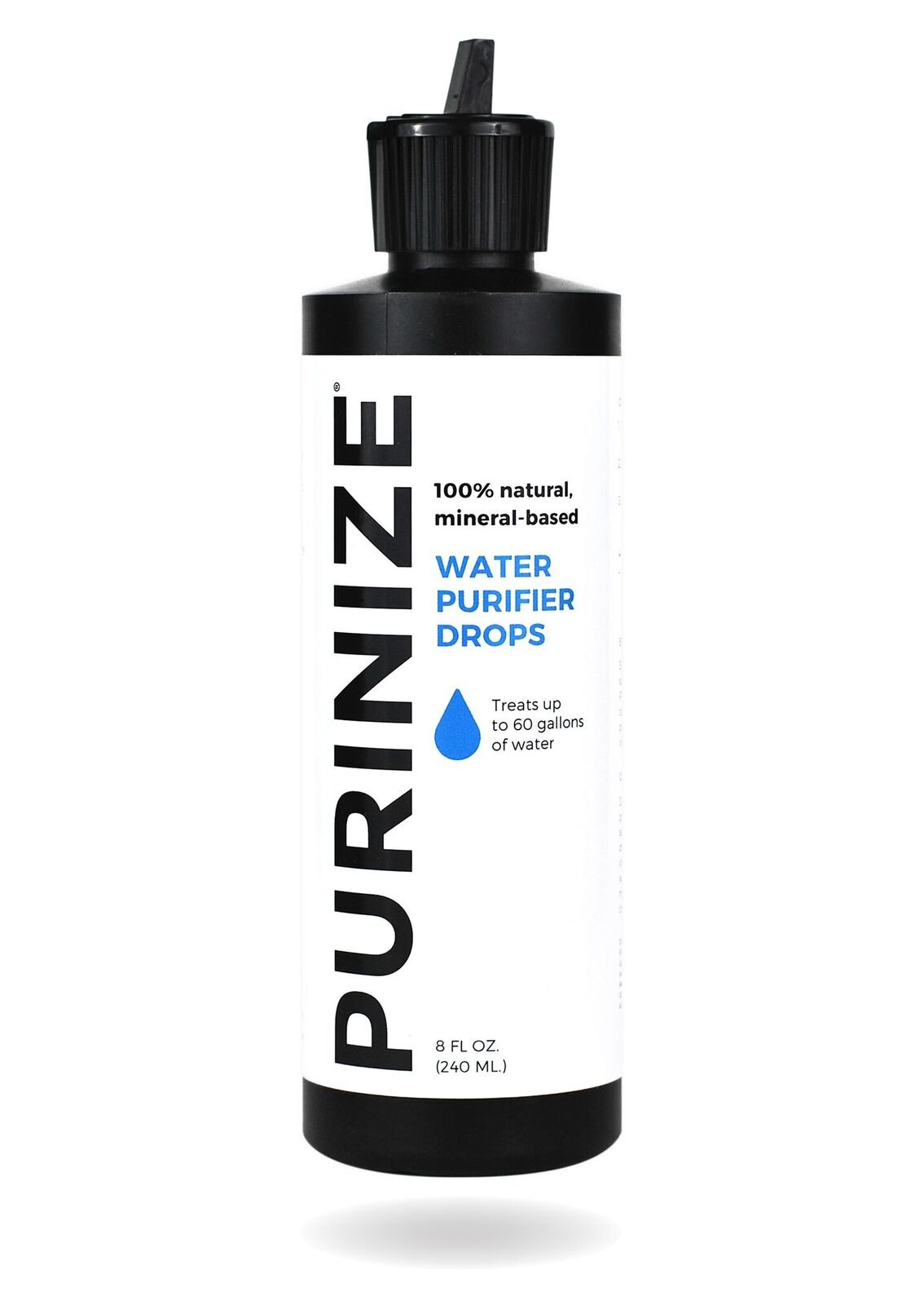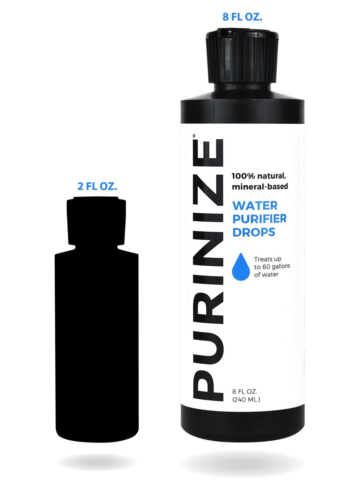 PURINIZE is for the adventurer. The wanderer. The nomad. The prepared. For those who need to get out there, and stay out there. Be ready for any adventure, trip, or emergency with PURINIZE. Whether you're hiking or camping in the back country, preparing a survival kit, or traveling to a city outside the country, PURINIZE is for you. PURINIZE naturally disinfects and clarifies water without harsh chemicals, making it safe to drink and use. Its 100% natural, mineral-based formula eliminates/reduces 200+ contaminants including bacteria, protozoan cysts, chemicals, heavy metals, and more. A single 2oz bottle will purify 15 gallons of water! Directions: Add 20 drops per quart (liter) or 1 tsp. per gallon of water. Shake/stir well & let stand for at least 60 minutes. Strain water through a regular water filter, coffee filter, or cloth to remove particulates. Water is now ready to drink or use for brushing your teeth, washing your hands/face, washing/cleaning your food. How Does Purinize Work? PURINIZE works through the process of Coagulation-Flocculation (CF). It contains a natural combination of coagulating and flocculating mineral salts that disinfect and clarifies raw water. CF removes suspended pollutants, in the form of microscopic particles or gross organic matter, by trapping them and clumping them together to form particulates. These entrapped particulates eventually settle and can be easily removed from the purified water by straining through a regular filter, coffee filter, or fine cloth. PURINIZE is the only water treatment product that naturally disinfects and clarifies water through the process of CF without chemical disinfectants or other synthetic ingredients. The CDC has compiled information on the CF process in the "Water Disinfection for Travelers Guide"