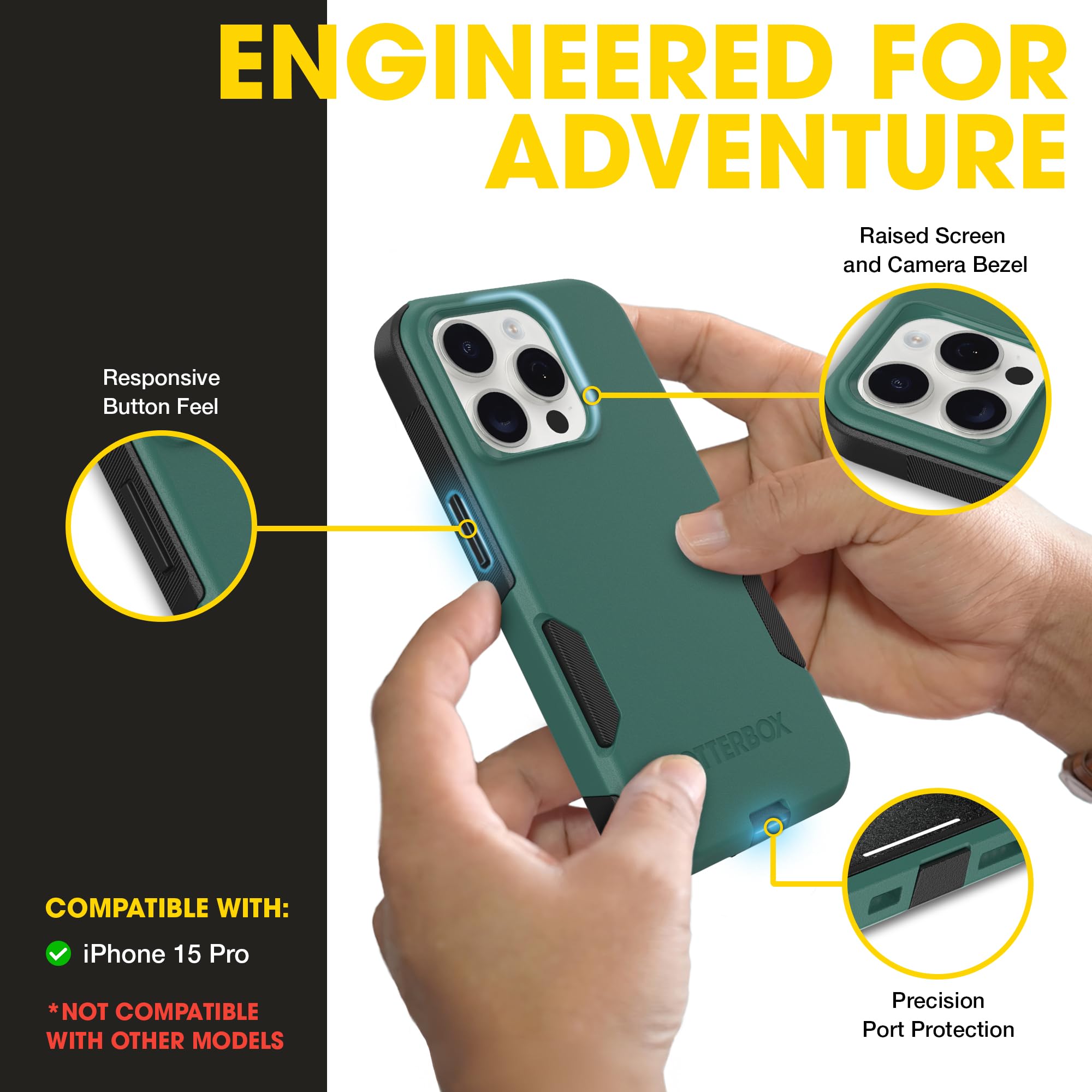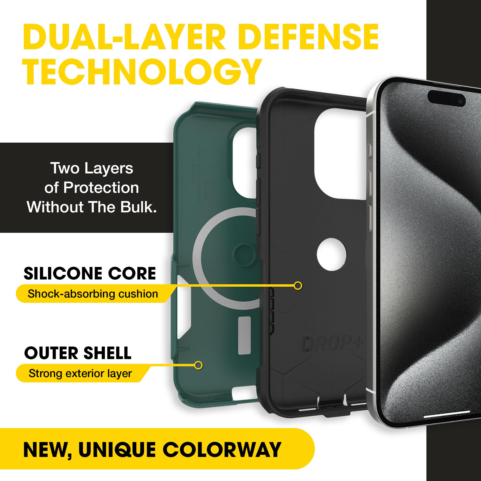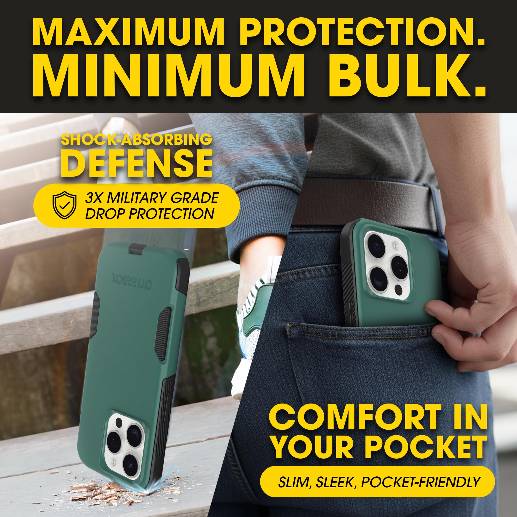 Meet Your Everyday Adventure Partner Your iPhone is more than a device — it's your camera, wallet, GPS, and connection to everything that matters. The OtterBox Commuter Series is engineered for people who demand protection without compromise. Why Commuter Stands Out: 3X Military-Grade DROP+ Testing: Survives 78 drops from 4 feet at multiple angles Dual-Layer Defense System: Shock-absorbing inner silicone paired with a hard polycarbonate outer shell Precision Port Covers: Designed to help keep out dust, dirt, and moisture while opening smoothly with repeated use Wireless Charging Compatible: Works with wireless chargers (no magnets in case) Perfect For: Urban professionals who pocket-carry Parents balancing life and devices Anyone who drops their phone regularly People tired of choosing between protection and style Compatible with iPhone 15 Pro Choose OtterBox. Choose confidence. Choose protection that works when it matters most.