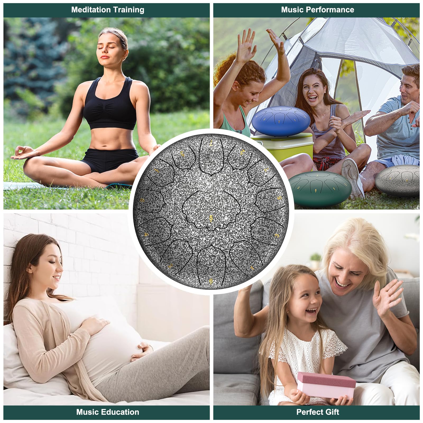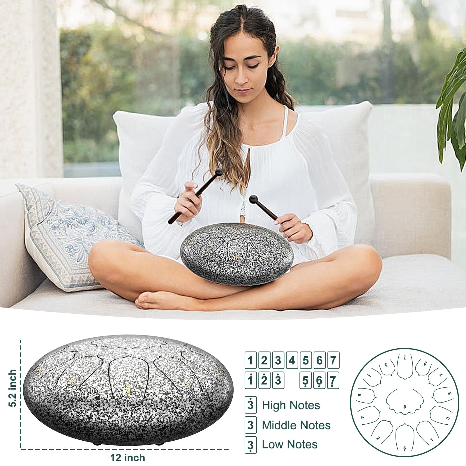 Unique Gift For Family Or Friends: Include 1*large steel drum, 1*drum bag, 2*drum mallets, 1*mallets stand, 1*music book—everything needed to start a musical journey. The calming effects of the rain drum's sound bring clarity and peace of mind, making it an ideal gift for kids, women, or men for Christmas, birthdays, get-well wishes, or white elephant exchanges.
