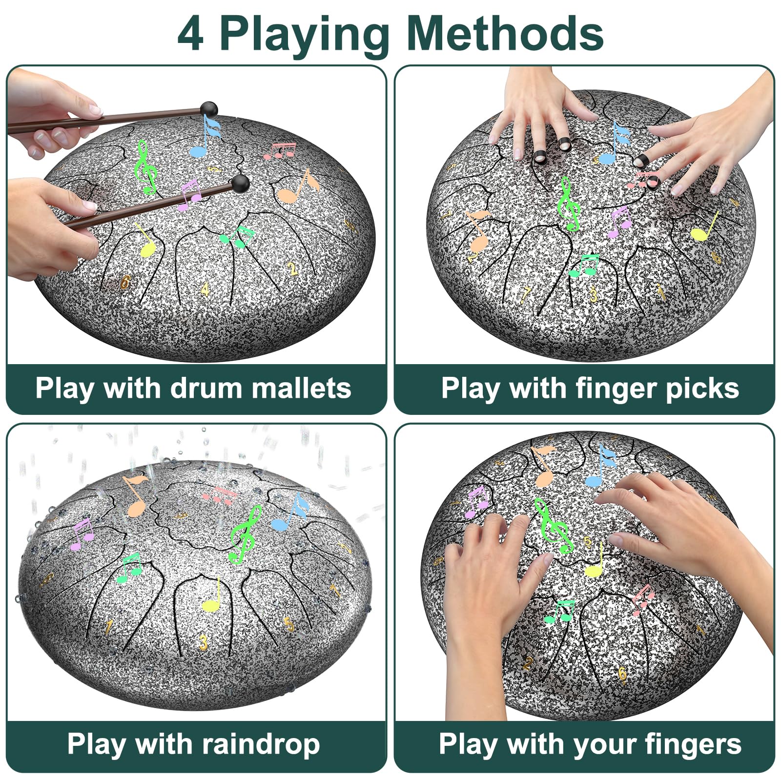 Easy To Pick Up: Whether you're a beginner or a seasoned musician, this rain tongue drum is designed for ease of use. Simply tap the hand pan drum rhythmically with the included mallets to create enchanting melodies. With the additional music book provided, you can start playing beautiful tunes even without any prior musical knowledge. It's a fantastic choice for music lovers of all ages!