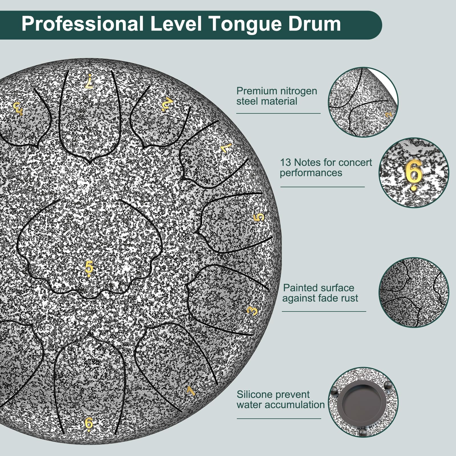 Larger Steel Tongue Drum: The steel drum features 13 tuned notes in D Major, offering a broad sound spectrum that allows for a variety of musical expression. When the drumstick beats the tongue and vibrates, the cavity resonates and makes a pleasant sound. The tone is beautiful, clear, and melodic. Bring a break from electronics.