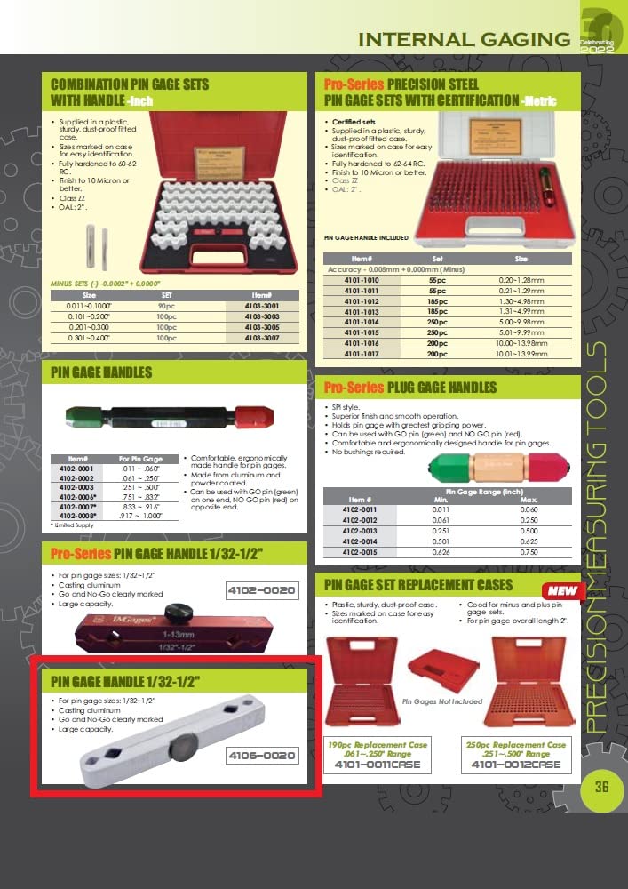 HHIP 1/31-1/2" aluminum pin gage handle is used for pin gage sizes 1/32-1/2". Casting aluminum. Go and No-Go clearly marked. Large capacity.