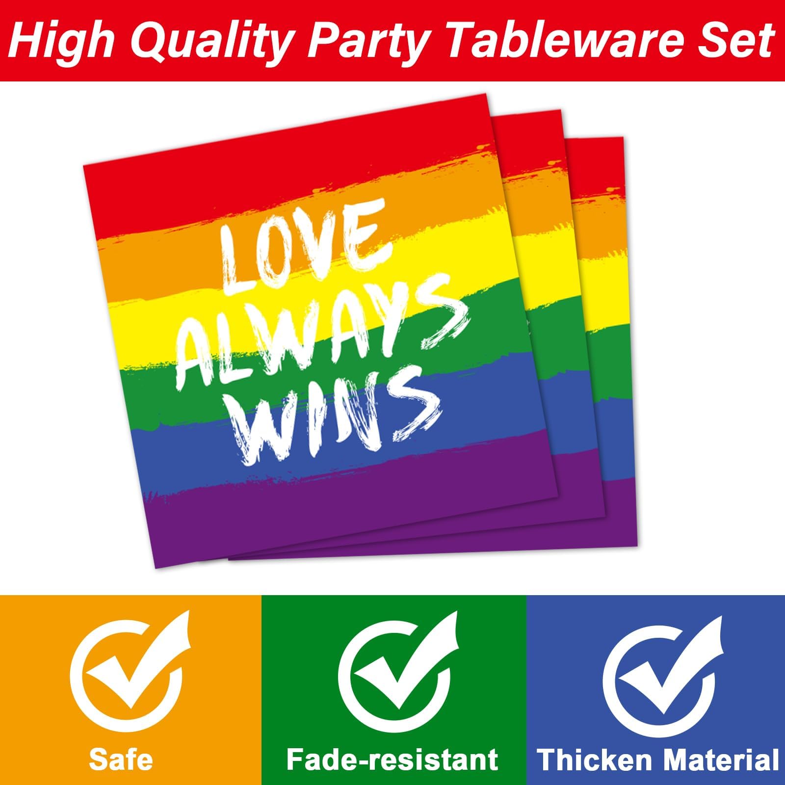 Exquisite Patterns:This Pride party dinnerware set is printed with “CAN'T HIDE OUR PRIDE”.”LOVE”,”LOVE ALWAYS WINS”,rainbow colorful striped decoration,bright and beautiful colors.It's very suitable for pride theme party decoration as well as for daily life.