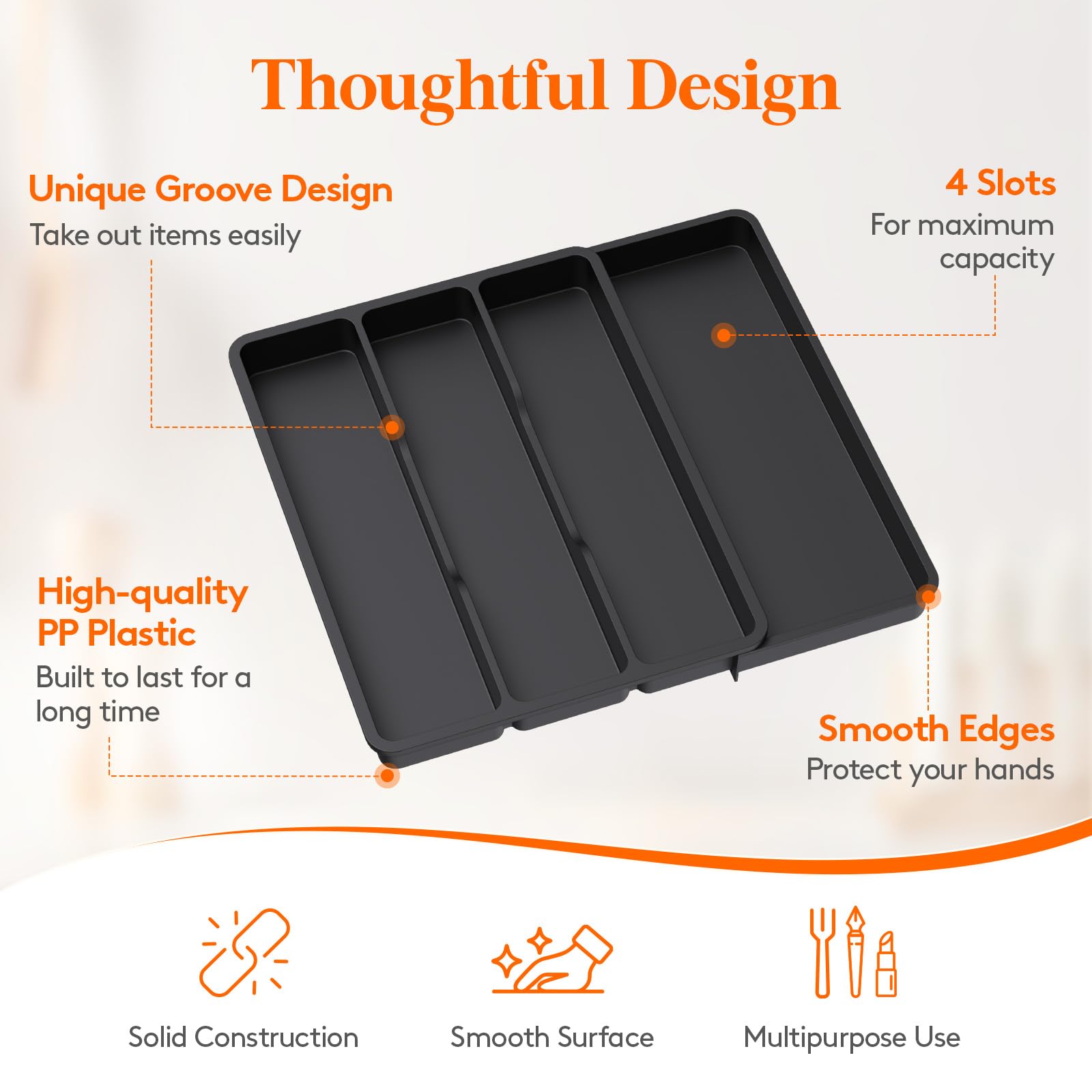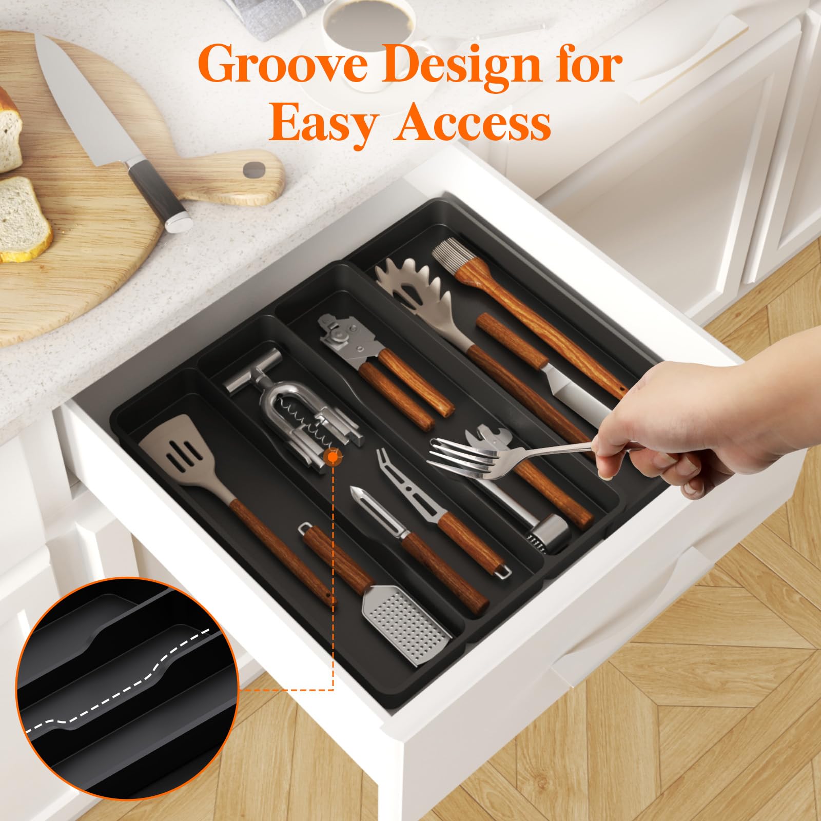 Sort Your Silverware: The silverware tray comes with 3-4 compartments, creating more space in drawers for spatulas, ladles, tongs, utensil sets, and whisks. Streamline your cooking with a no-install organizer that keeps cutlery at your fingertips