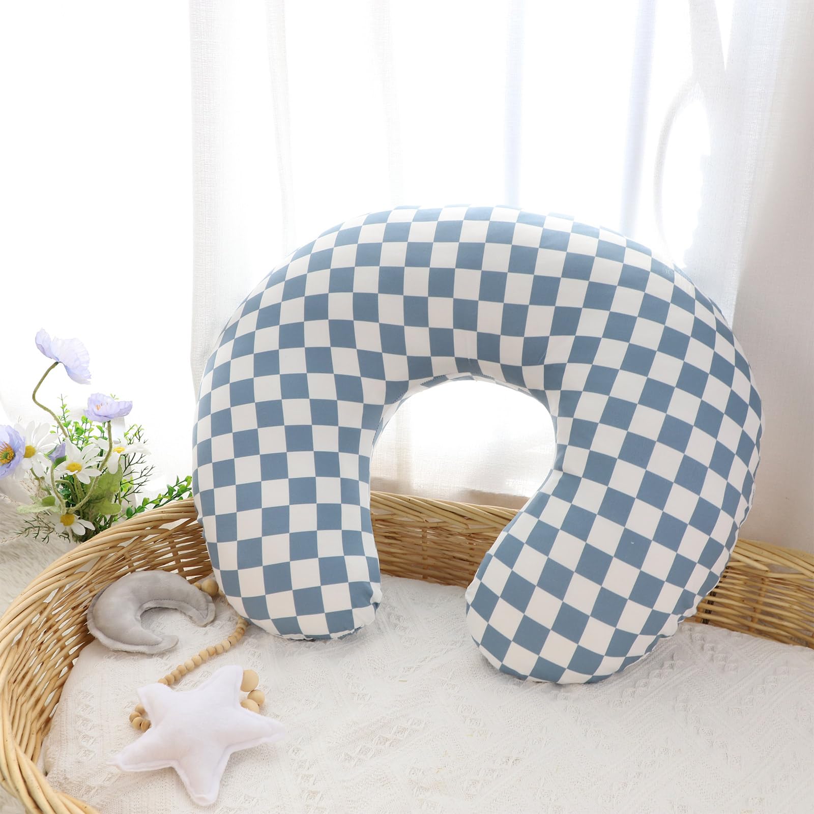DILIMI Nursing Pillow Cover, Stretchy Removable Case for Breastfeeding Pillows, Ultra Soft Comfortable Slipcover for Baby Girl and Boy, Blue Checkerboard