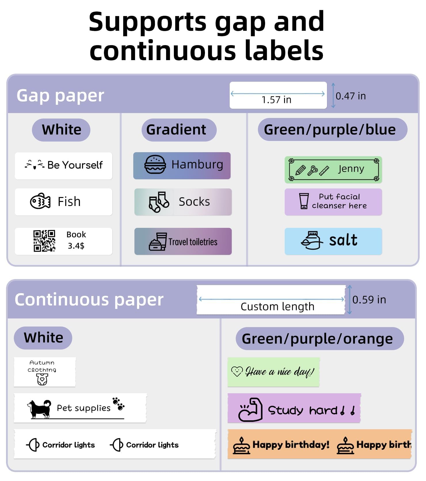 Multiple Creative Functions: The Snap & Tag app for this Bluetooth label maker provides various features and templates, easily create label stickers with text, QR codes, barcodes, materials, images, time, and borders; Customize label lengths with continuous tape, or use fixed-size labels for batch printing, featuring a built-in cutter for simple label cutting