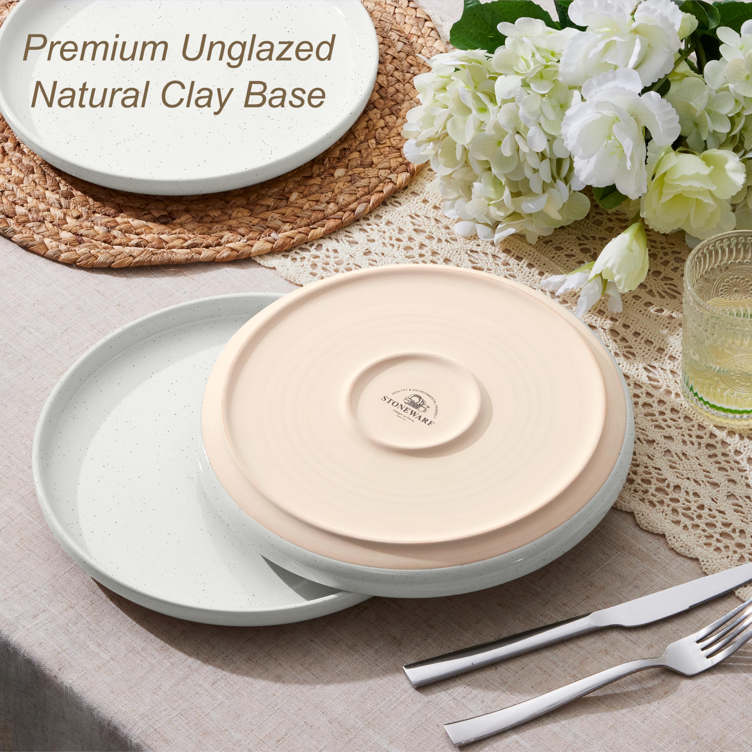 Healthy Stoneware: made of premium lead-free stoneware, no harmful substance leaching into your food, fried at 2400℉ high temperature for 13 hours, making the plates sturdy enough to resist chipping, preventing scratches from your knives and forks