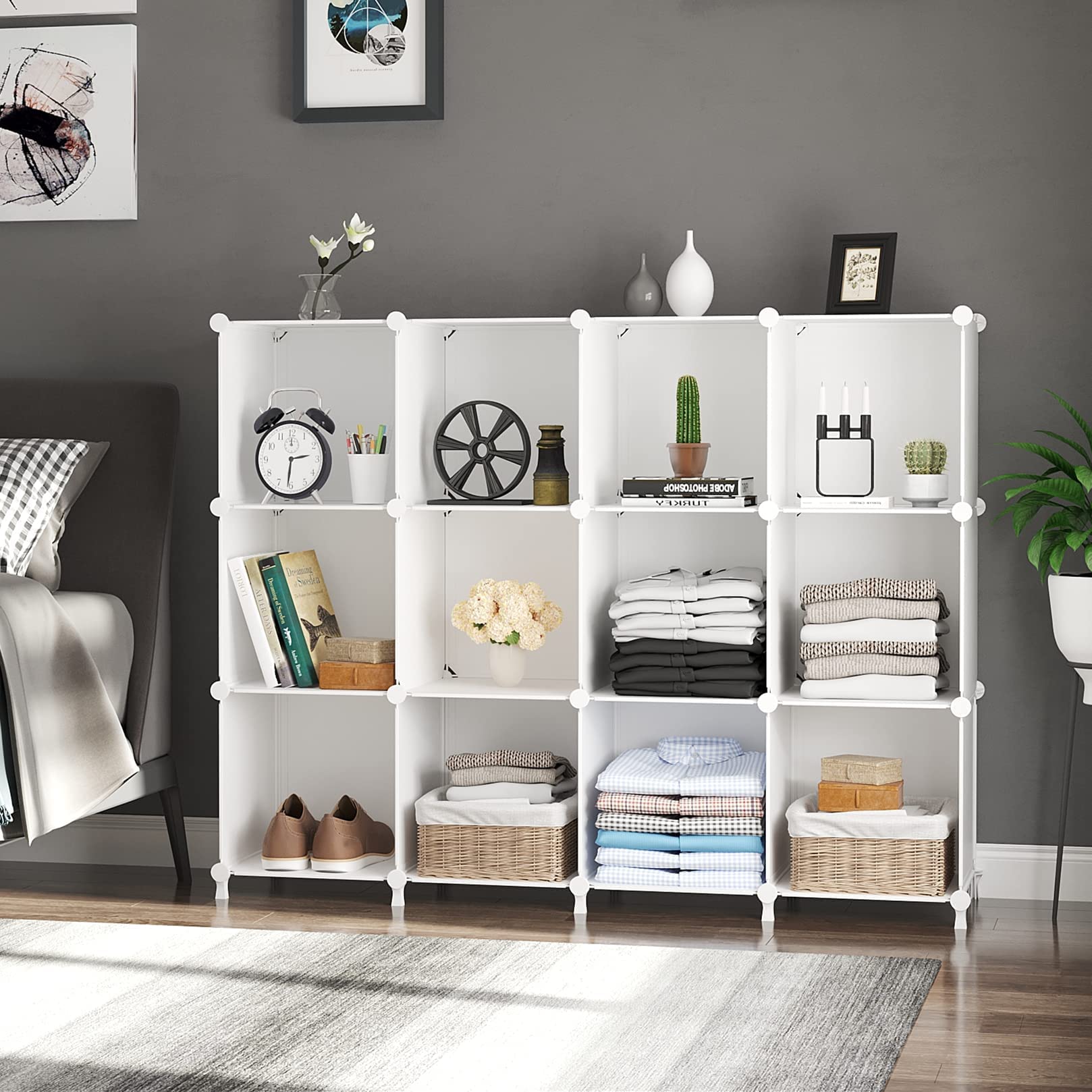 Large Storage System: Each cube size is 11.8x11.8x11.8 inch, 12 cube storage shelf with enough storage space for you to store books, toys, yarn, shoes, clothes, bags, purse and more everyday things you want to store, a ideal home storage solution for you