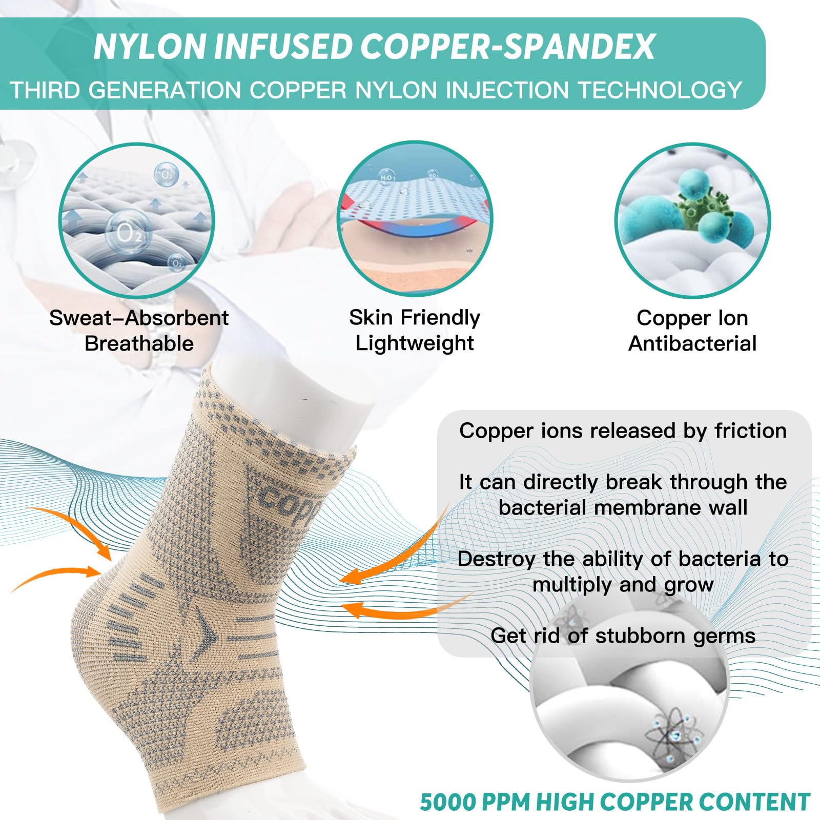✔️Real high copper-infused nylon material-breathable and deodorant: INDEEMAX copper ankle brace for men & women is made from high copper-infused nylon (copper ion+5000PPM) +10% spandex material, the copper ions are studied can be used to deodorize, keep skin healthy, and absorb moisture. High-quality nylon material makes it have good elasticity and sufficient support, so our copper infused ankle support compression sleeve can be worn with shoes and socks while effectively improving injury prevention performance!
