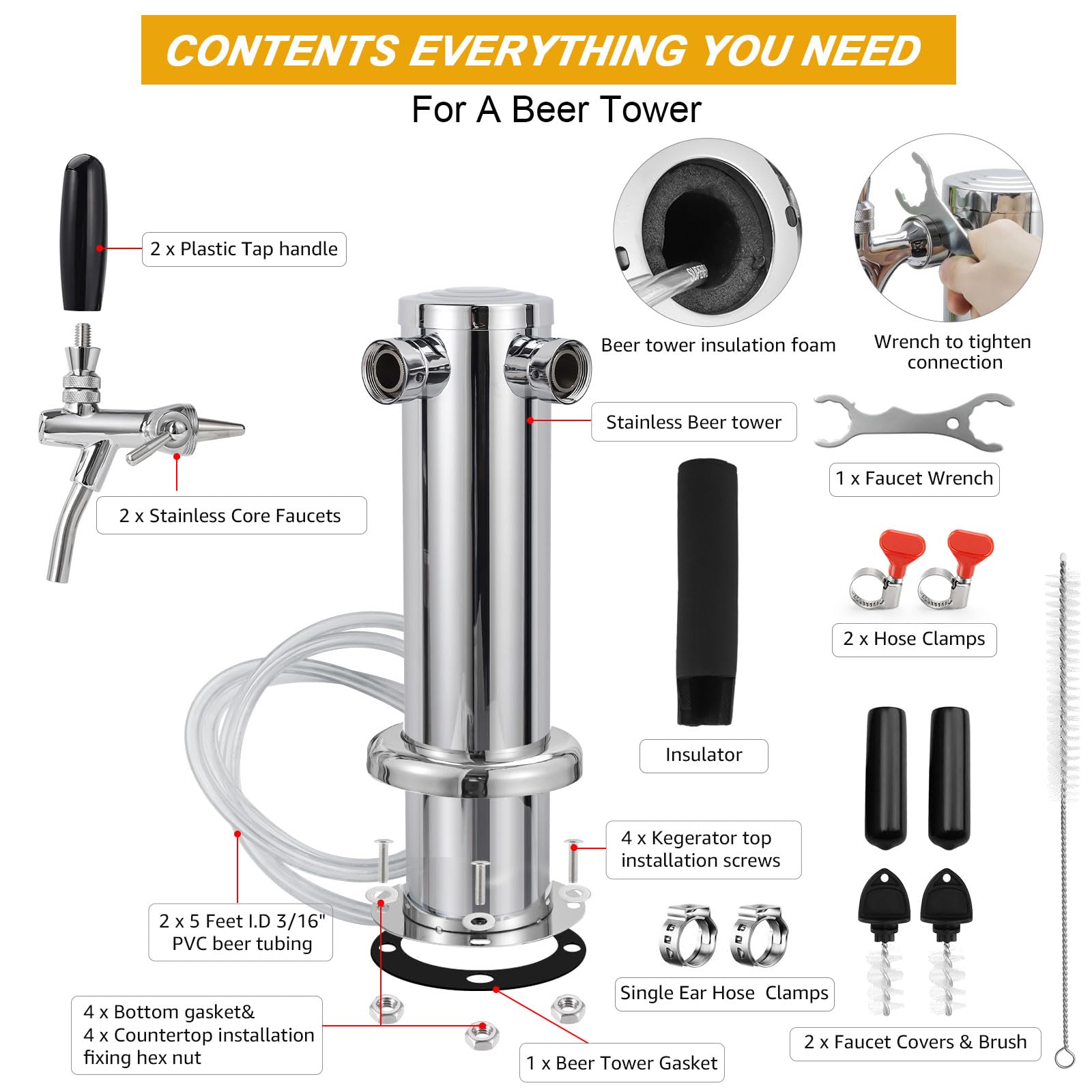 Contents Everything You Need For A Beer Tower: Comes with 1 stainless steel column, 2 Long Shank Adjustable Faucet, 2 of 5 feet 3/16"" I.D. tubing, 1 beer tower gasket, 4 sets of M5 screws and nuts, 2 clamps, 2 beer faucet soothers, 1 beer tap wrench, and 1 cleaning brush. A complete beer dispenser tower. Please let us know if there are any problems, we will try our best to serve you. Provide technical support