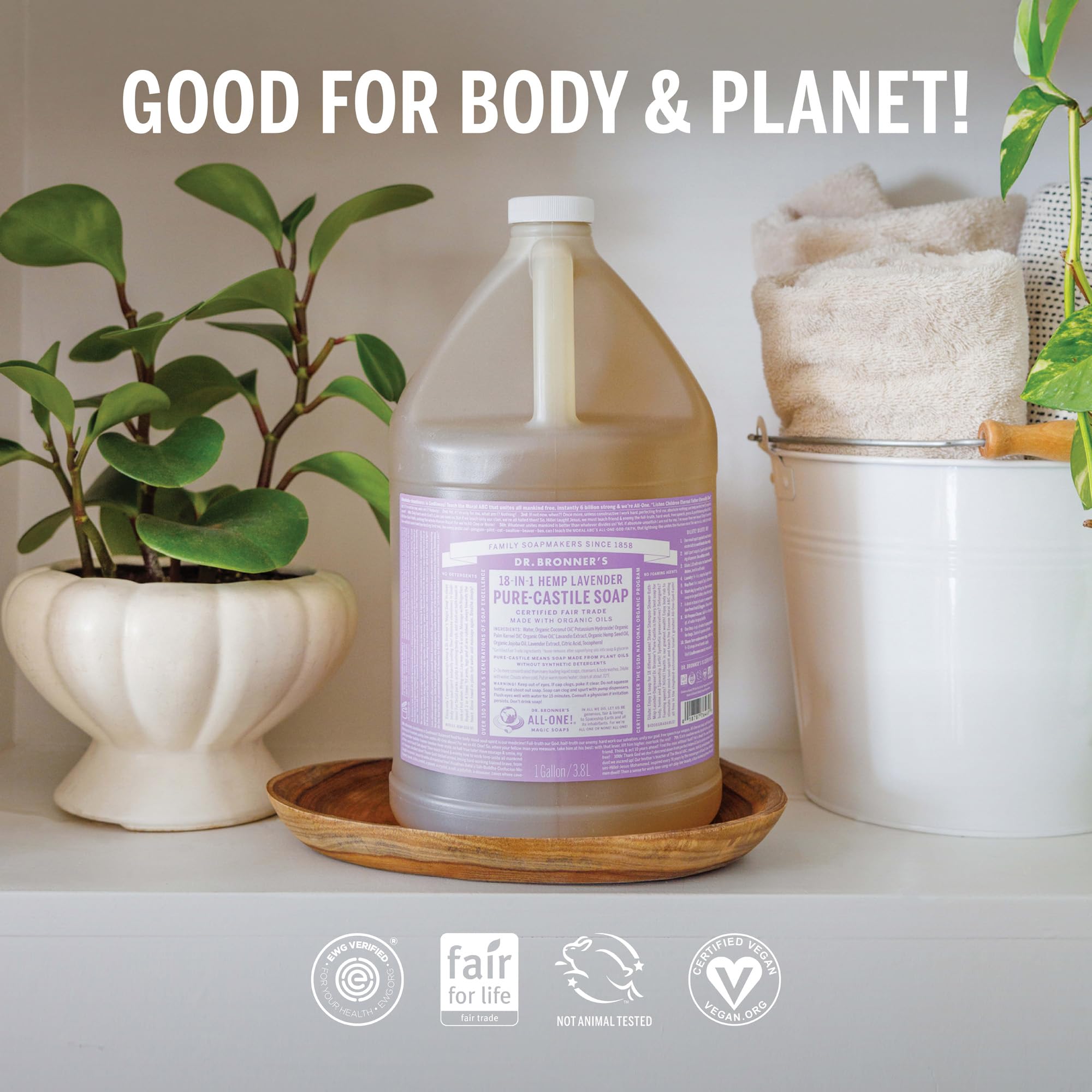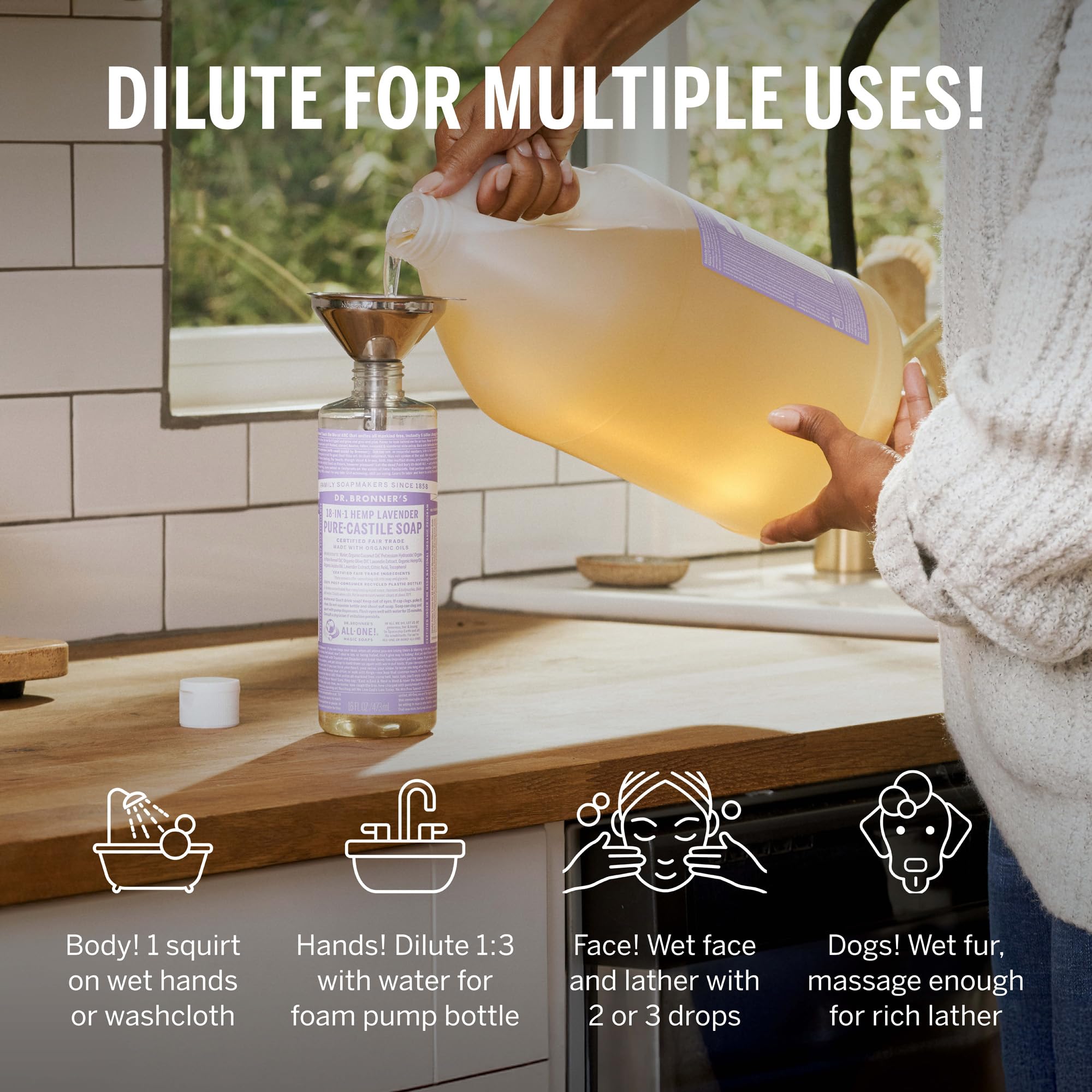 3X MORE CONCENTRATED THAN MOST LIQUID SOAPS: Dilute! Dilute! Use as dish soap, makeup brush cleaner, pet wash, or laundry soap. A little goes a long way—less waste, more value. This versatile Dr. Bronner’s gallon castile soap is made for countless uses
