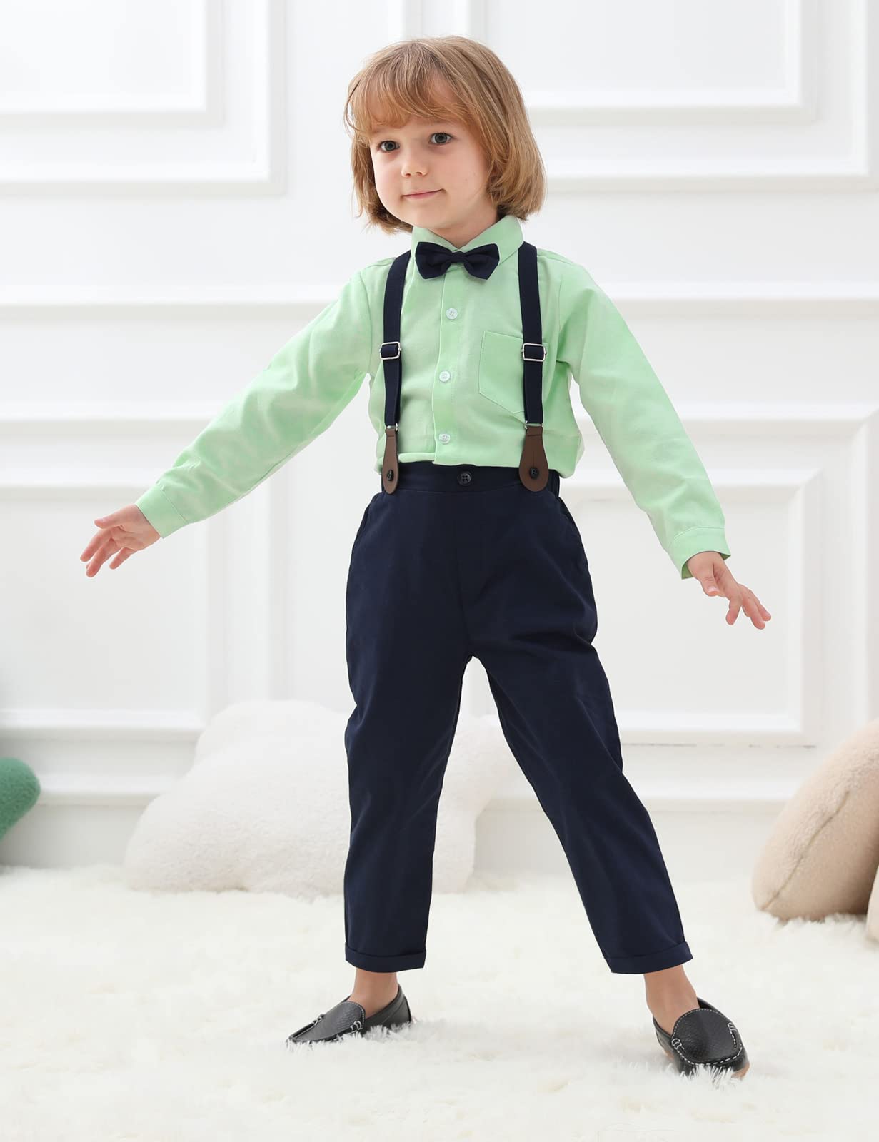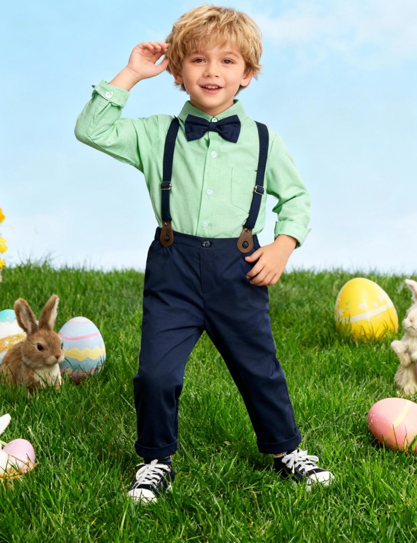 Toddler boy dress outfit consists of long sleeve dress shirt, elastic-waist pants, detachable bow tie and stretch suspender.