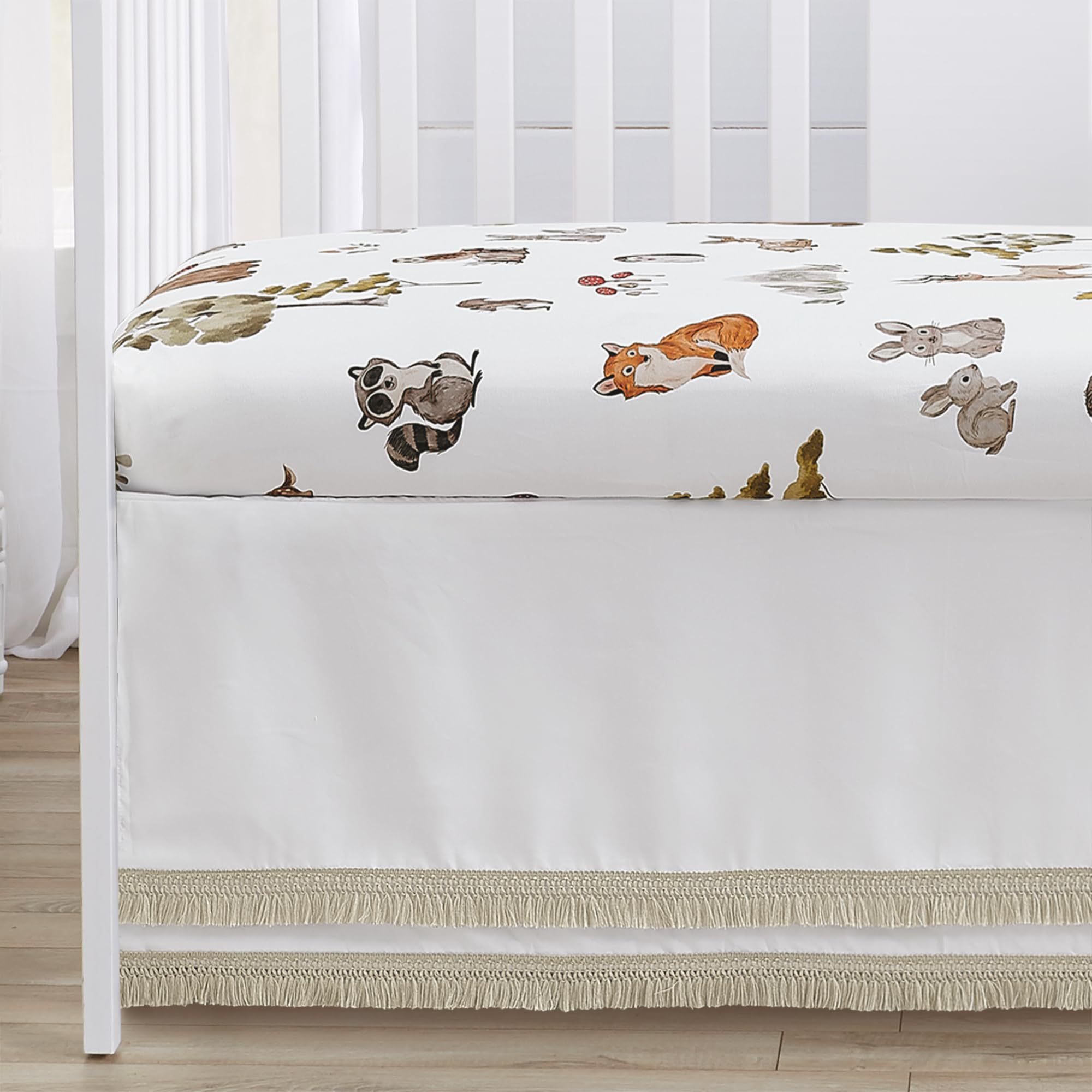 WOODLAND THEME: This baby boy bedding set boasts a crib blanket featuring a hand painted watercolor forest animals print with quilted deer, bear, fox & bunny that reverses to solid white. The white skirt is adorned with two rows of delicate bohemian macrame fringe detailing. The mini animal breathable crib sheet has elastic sewn around the bottom edge for a secure fit on most standard cribs. The matching diaper stacker keeps nappies conveniently organized. Machine washable. Tumble dry low.