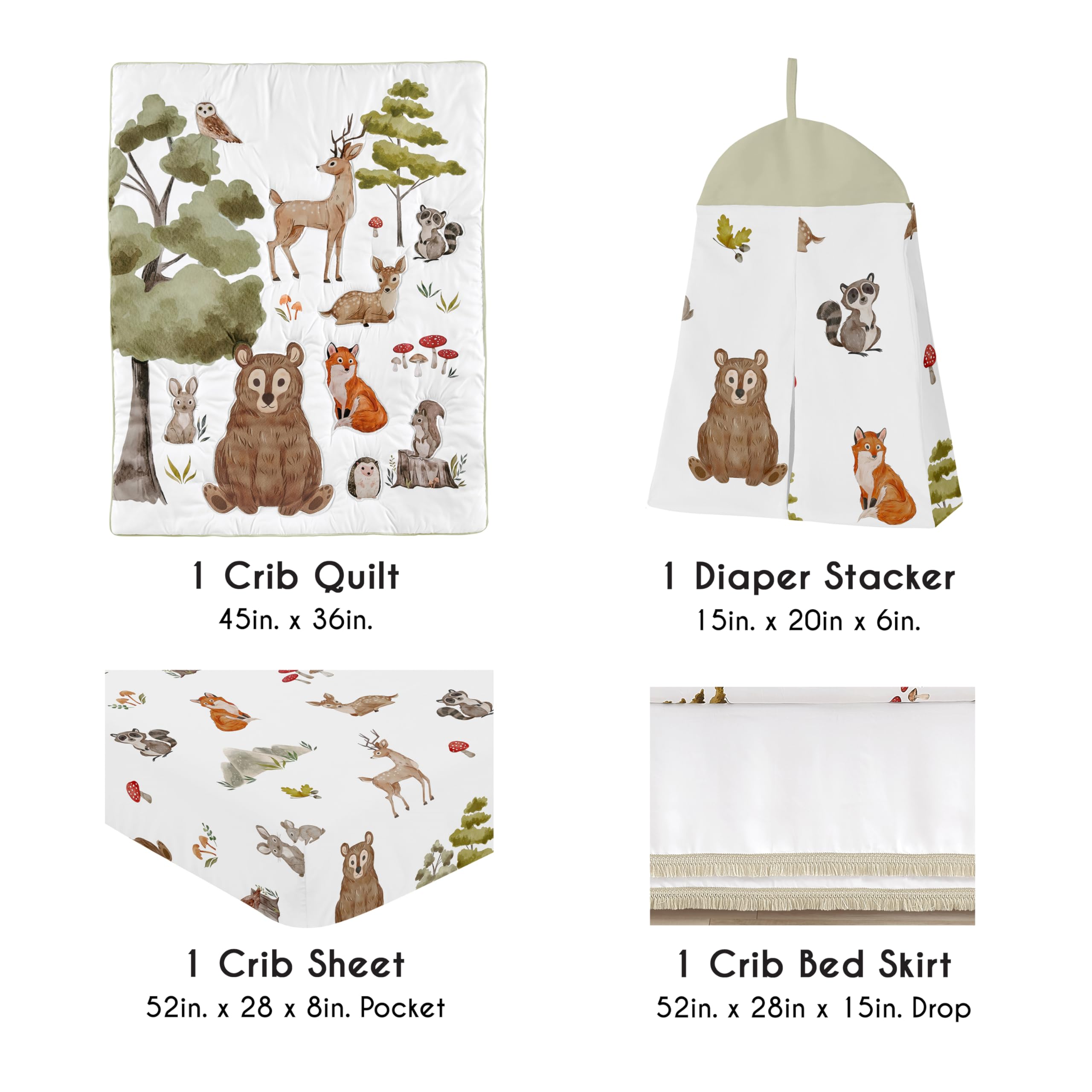 4 PIECE CRIB BEDDING SET INCLUDES: Crib Comforter (45in. x 36in.), Fitted Crib Sheet (52in. x 28in. x 8in. Pocket), Crib Skirt (52in. x 28in. x 15in. Drop) and Diaper stacker (15in. x 20in. x 6in.). An infant crib set including all the baby essentials is a great value compared to purchasing pieces separately. This baby crib set is made of soft microfiber fabric and features the earthy color palette of brown, taupe, and soft shades of sage green to bring your woodland themed baby room together.
