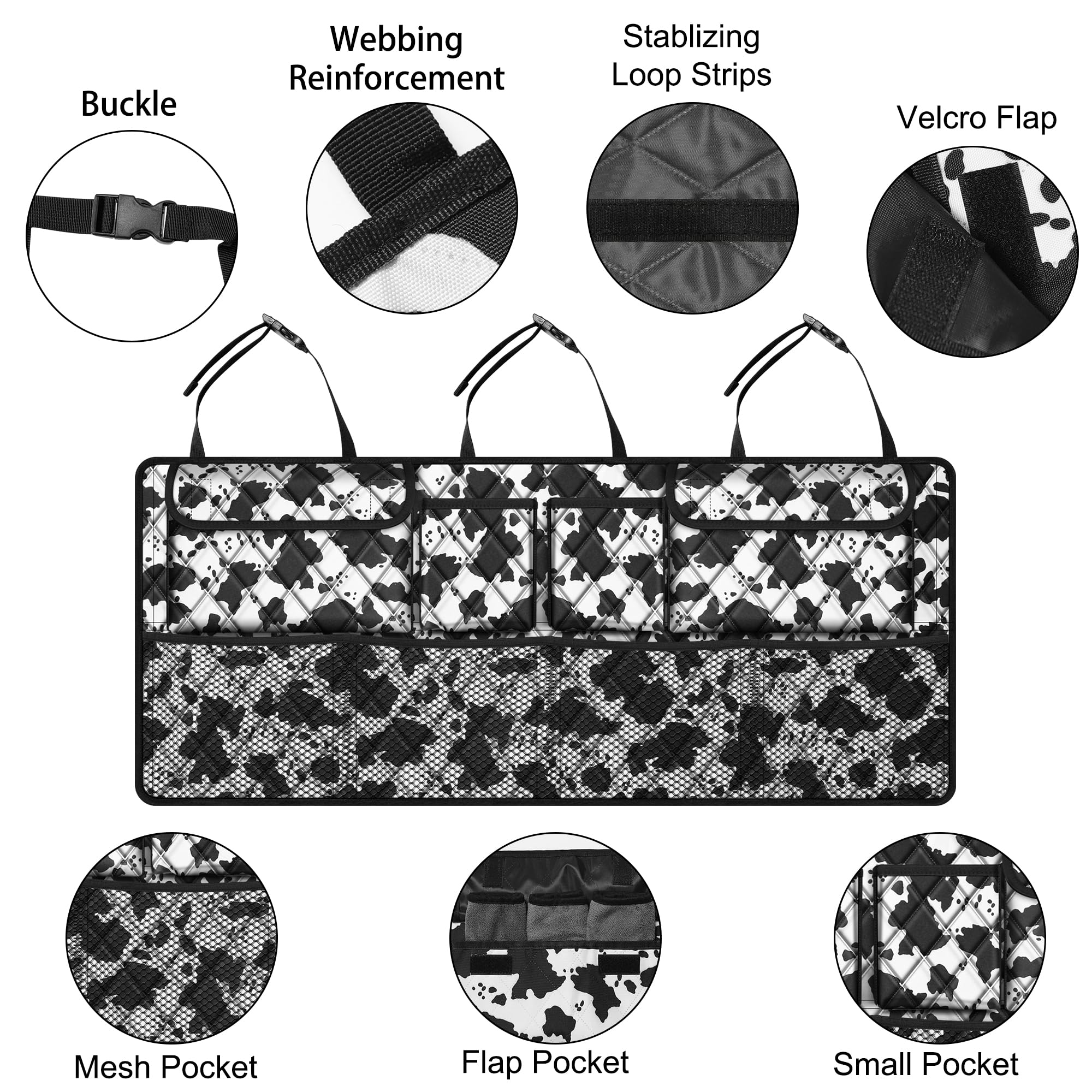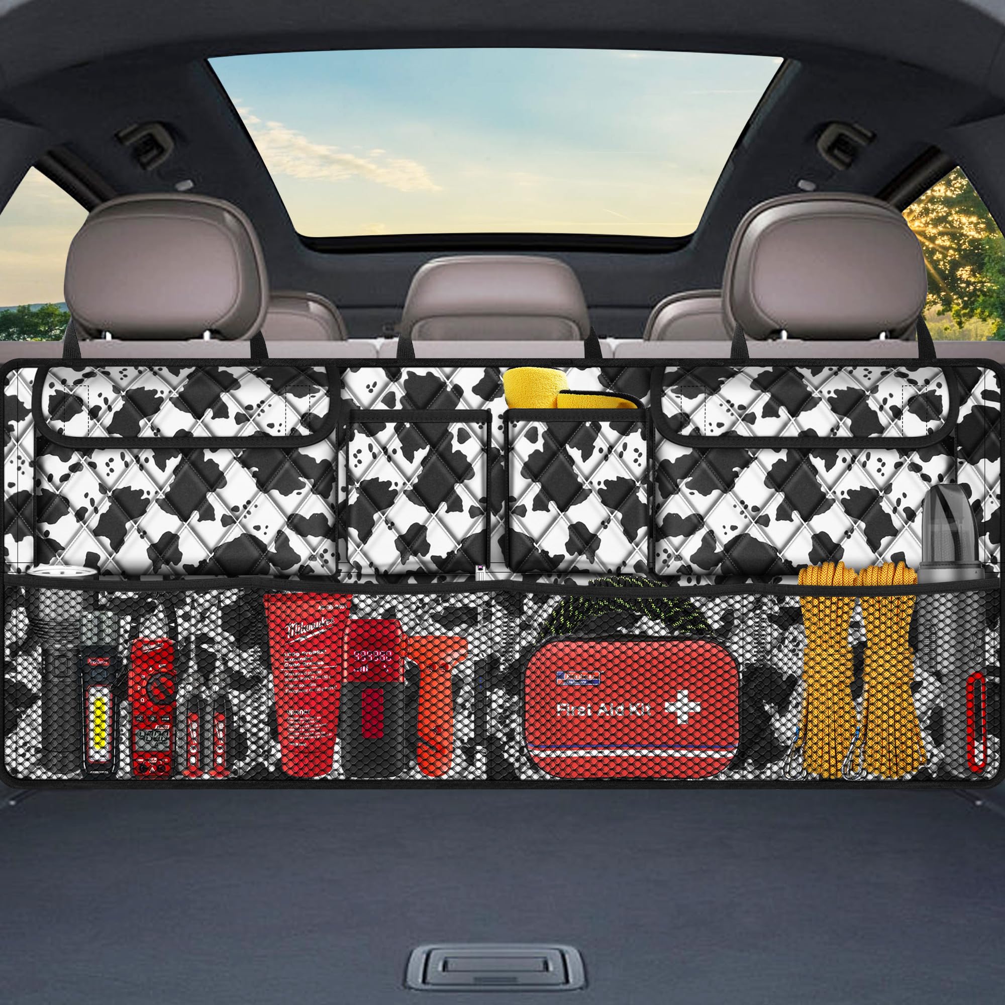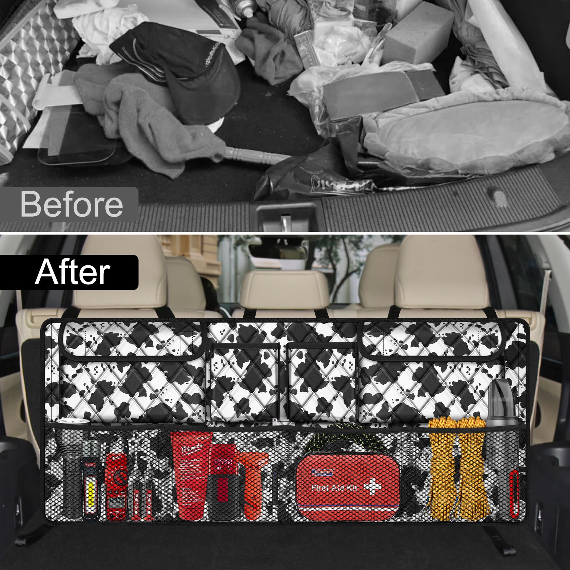 【Install Easily & Fit 90% Cars】The car trunk organizer holds with 3 strong straps and clip on and off buckles to install easily in seconds. Also fits 90% car types, this hanging trunk organizer for suv,jeep, trunk, minivan,ect.And it is perfect choice as car accessories for women and men.