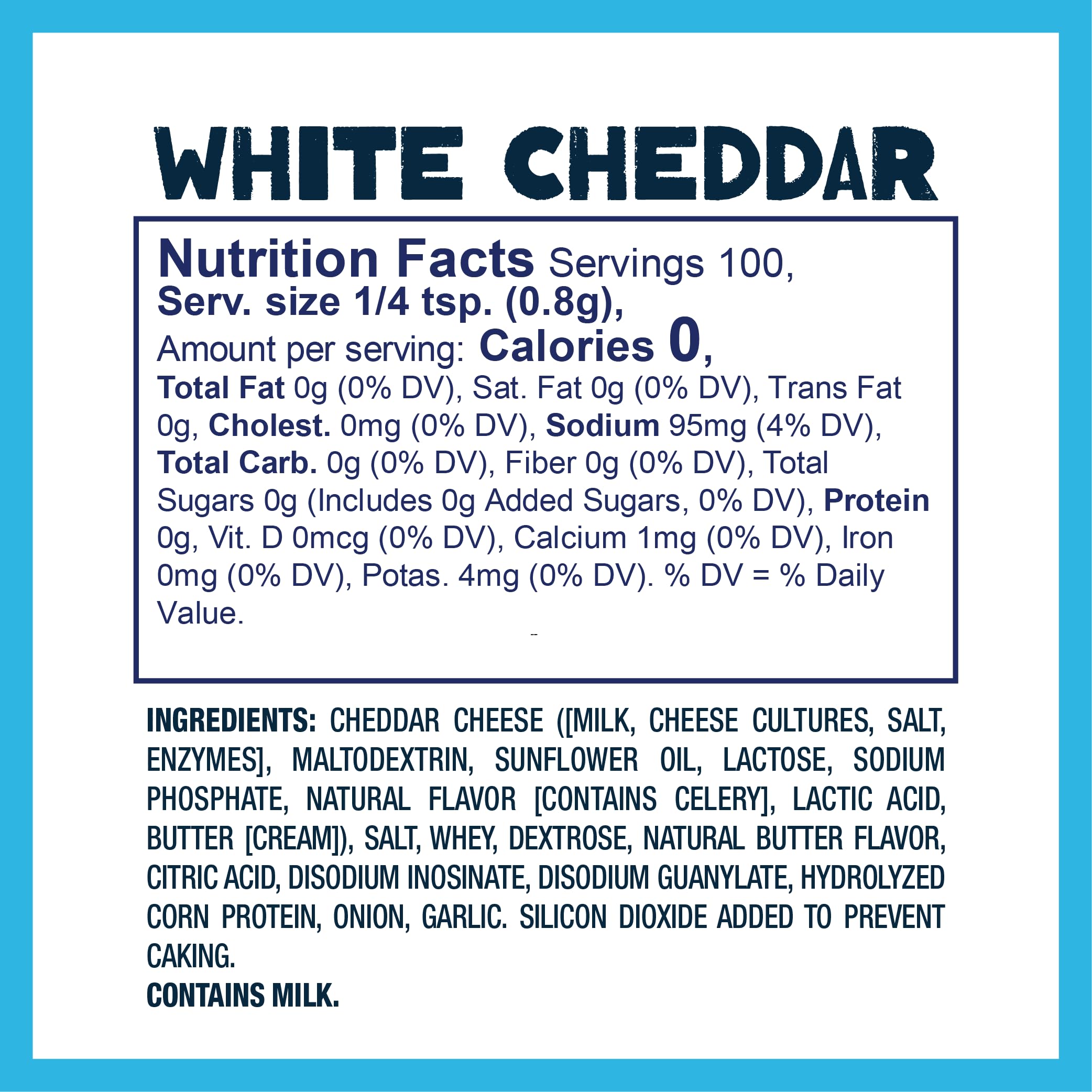 White Cheddar is the ninja of flavors. You can’t see it on popcorn, but it delivers a big, tangy real cheese punch. This low calorie flavor powerhouse is also the perfect addition to steamed veggies, chicken and potatoes. How to use: 1. Pop your favorite popcorn. Don’t have one? Try your new favorite, Kernel Season’s Premium Popping Corn. 2. Stovetop popper? Use Kernel Season’s Movie Theater Butter to pop up a kettle full. Microwave popper? Skip to Step 3. 2. Spritz your popcorn with Kernel Season’s Popcorn Butter Spritzer to help the seasoning stick to the popcorn (you could also top with Kernel Season’s Movie Theater Butter if you’re feeling extra delicious). 3. Sprinkle to taste with seasoning. 4. Shake to cover more popcorn. 5. Enjoy! Nutrition Serv. Size: 1/4 tsp. (0.8g). Servings Per Container: 100, Amount Per Serving: Calories 2, Total Fat 0g (0% DV), Trans Fat 0g, Sodium 90mg (4% DV), Total Carb. 0g (0% DV), Sugars 0g, Protein 0g. Not a significant source of other nutrients. Percent Daily Values are based on a 2,000 calorie diet. What's in this stuff? Ingredients: Cheddar Cheese (Blend of Cheddar Cheese, [Milk, Cheese Cultures, Salt, Enzymes], Maltodextrin, Whey, Soybean Oil, Lactose, Citric Acid, Lactic Acid), Salt, Whey, Butter Milk Solids, Dextrose, Hydrolyzed Corn Protein, Disodium Inosinate and Guanylate, Onion and Garlic. Silicon Dioxide added to prevent caking.