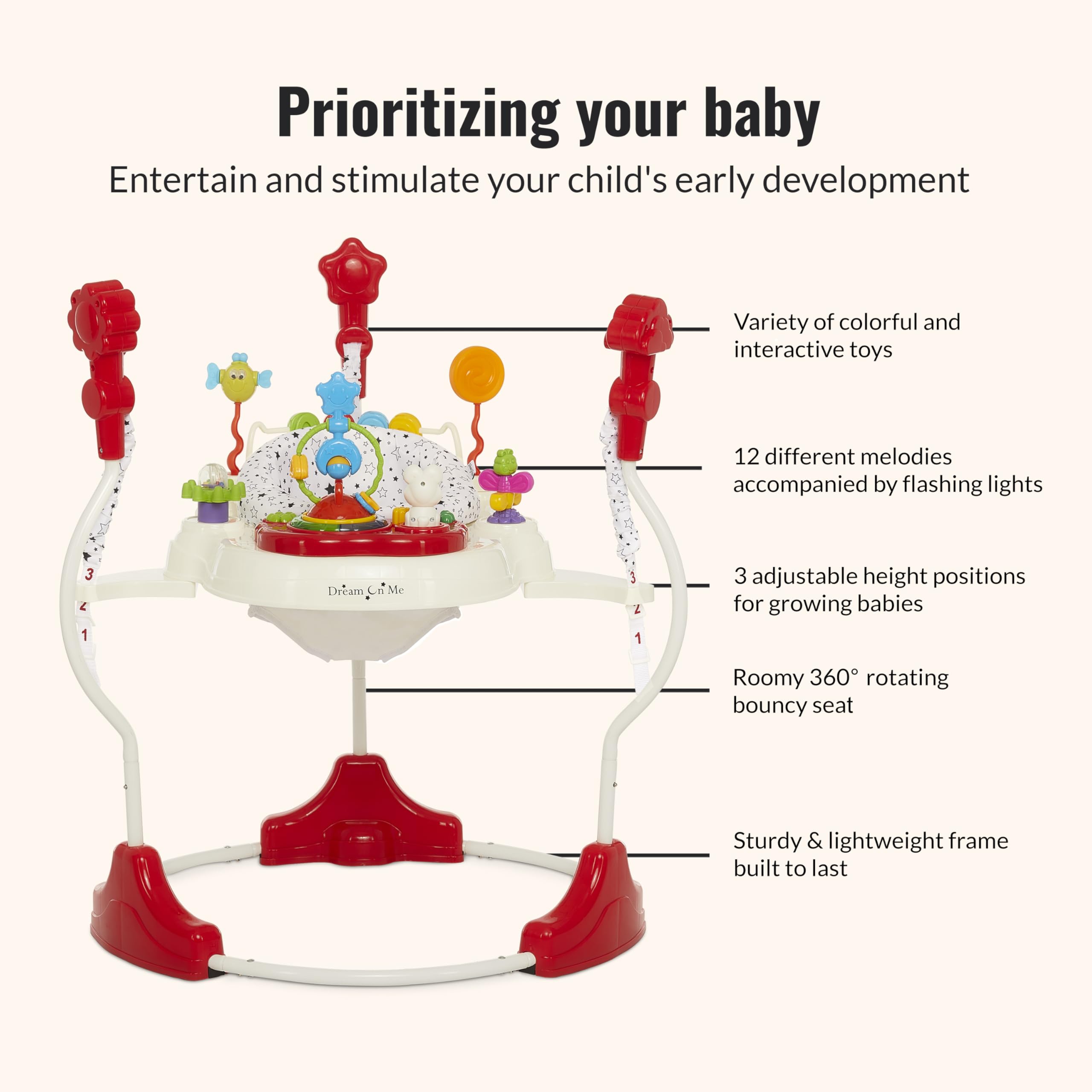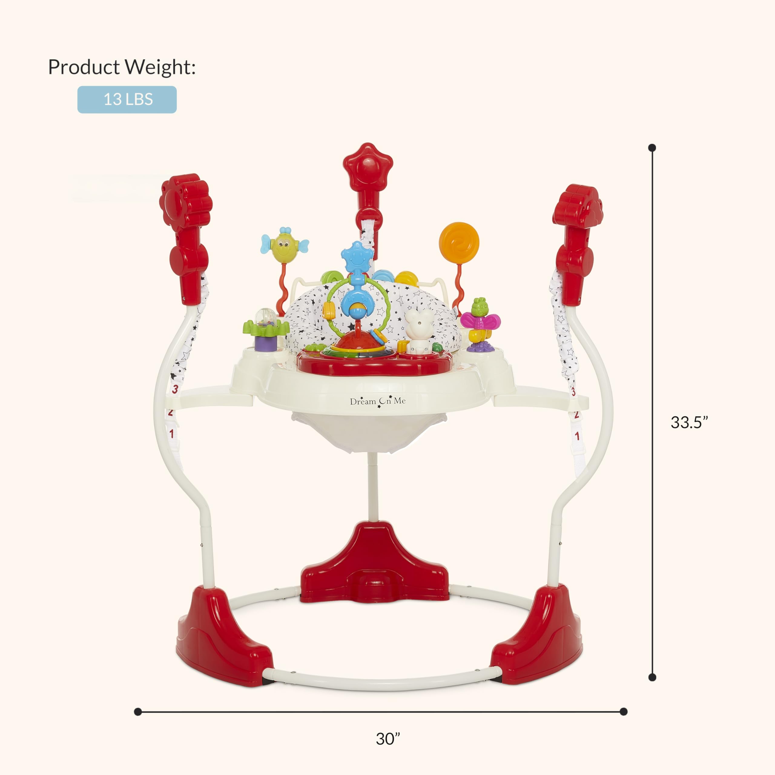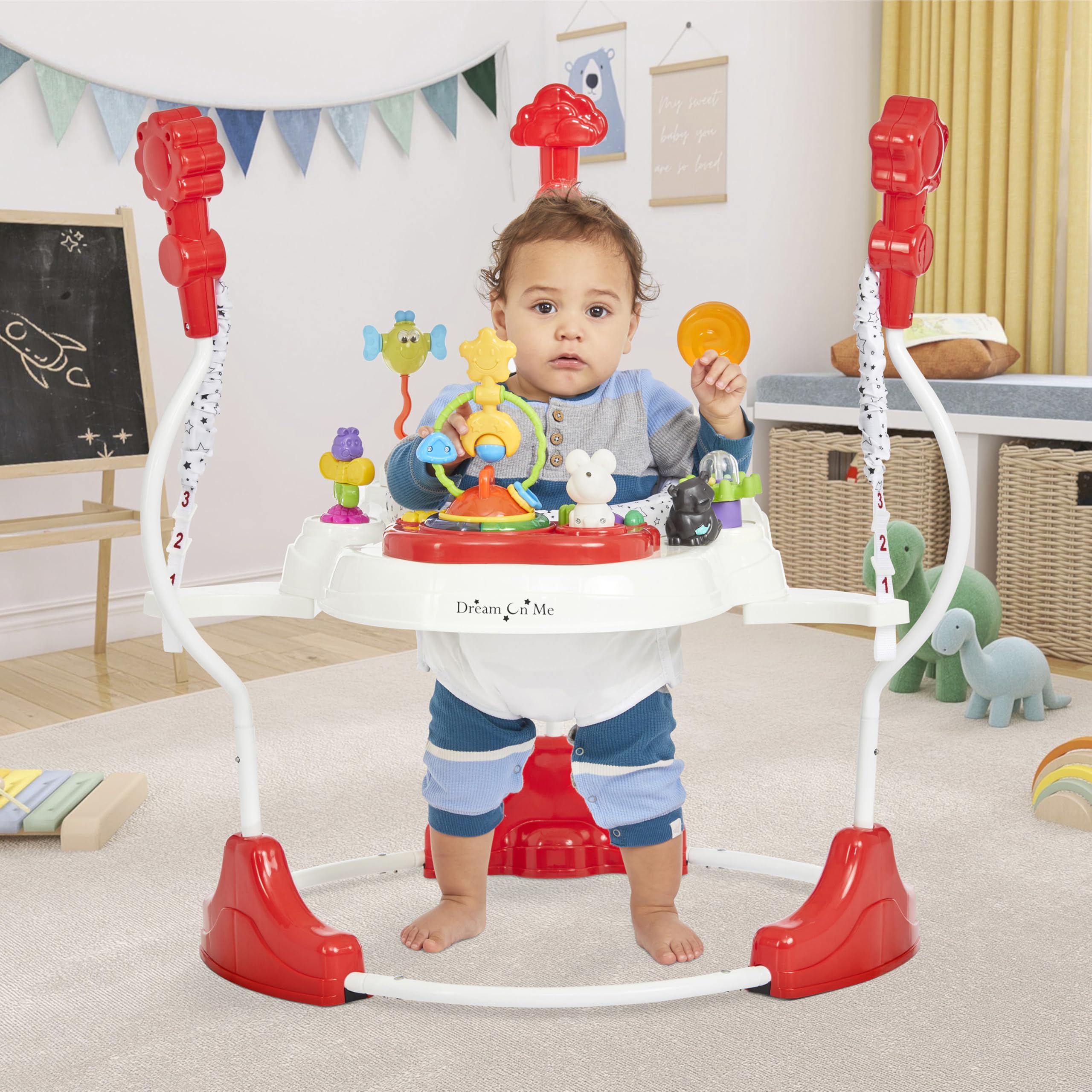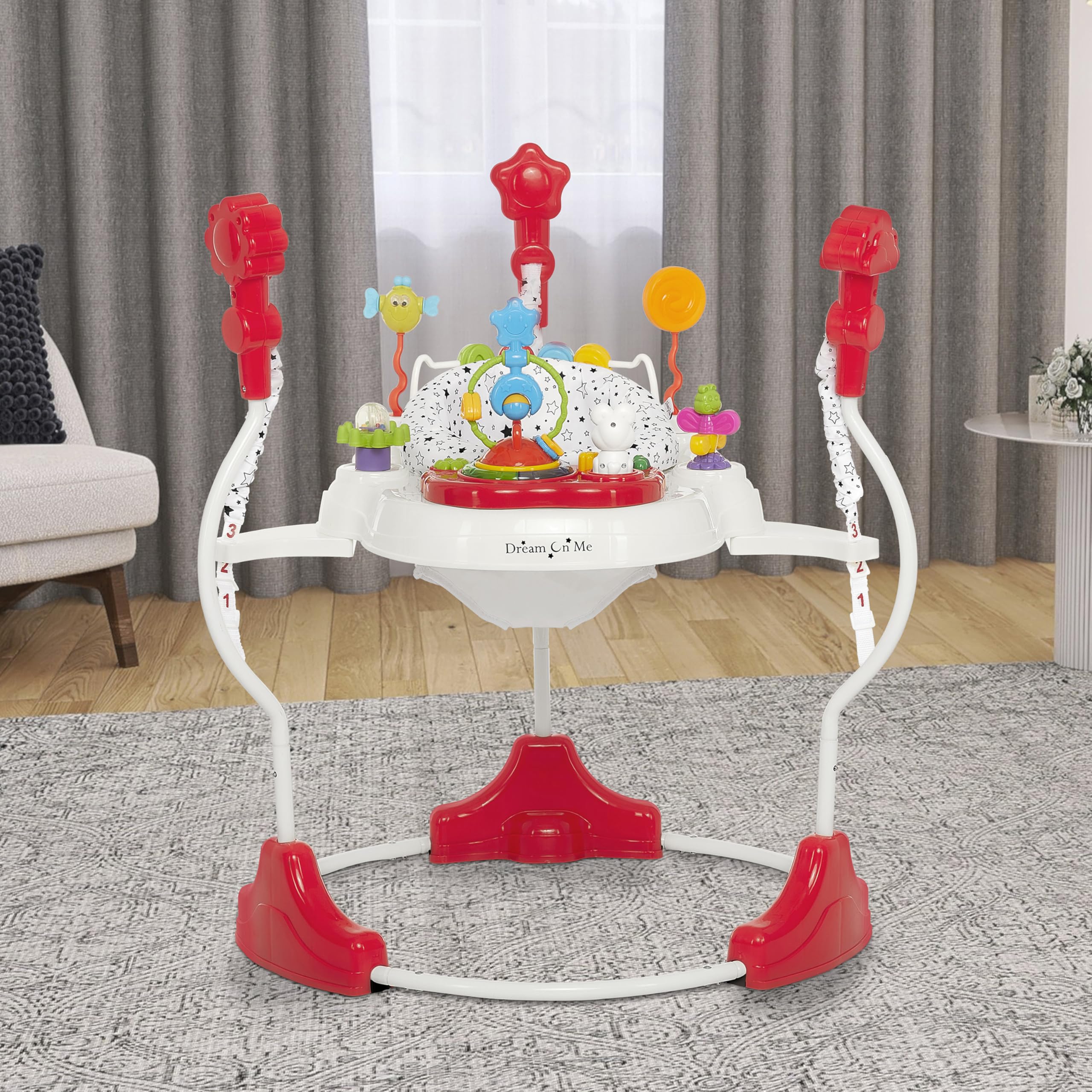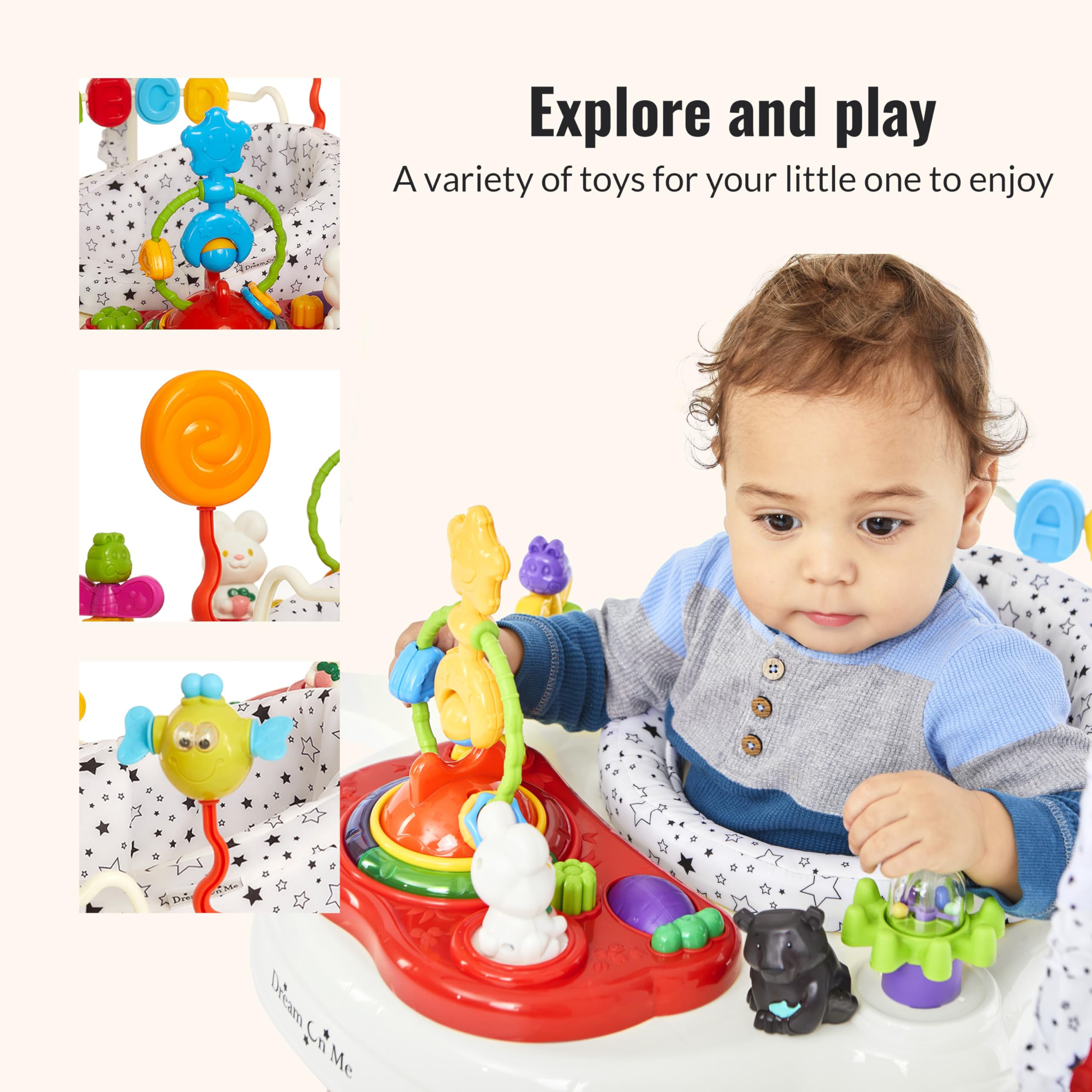 Playtime should be more than fun β€” it should be safe, engaging, and designed to grow with your little one. The Dream On Me Zany Activity Center Bouncer brings all these elements together in one thoughtfully crafted play space. With a 360Β° rotating seat, your baby can explore a full circle of interactive toys, lights, and sounds, each designed to spark curiosity and support motor skill development. From bouncing to reaching and grasping, every movement helps build strength and coordination. The interactive play station keeps your child entertained with colorful toys, playful music, and gentle lights that nurture sight, sound, and touch. Parents can feel confident knowing the Zany is built for safety. Its wide base and sturdy steel frame provide stability during active play, while the padded seat ensures comfort and secure support. Designed with child-safe materials and compliant with U.S. safety standards, it’s a worry-free space for discovery. One of its standout features is its dual use: as a vibrant activity center filled with toys, lights, and sounds, and as a stationary bouncer, creating a secure and engaging play area for your baby. This versatility makes it a true companion through early developmental milestones. Lightweight and easy to fold, the Zany fits seamlessly into small spaces and travels effortlessly to grandparents’ houses or playdates. With its cheerful elephant theme and parent-friendly design, it’s more than just a toy β€” it’s a safe, growth-focused activity partner that supports your baby’s learning and joy at every stage.